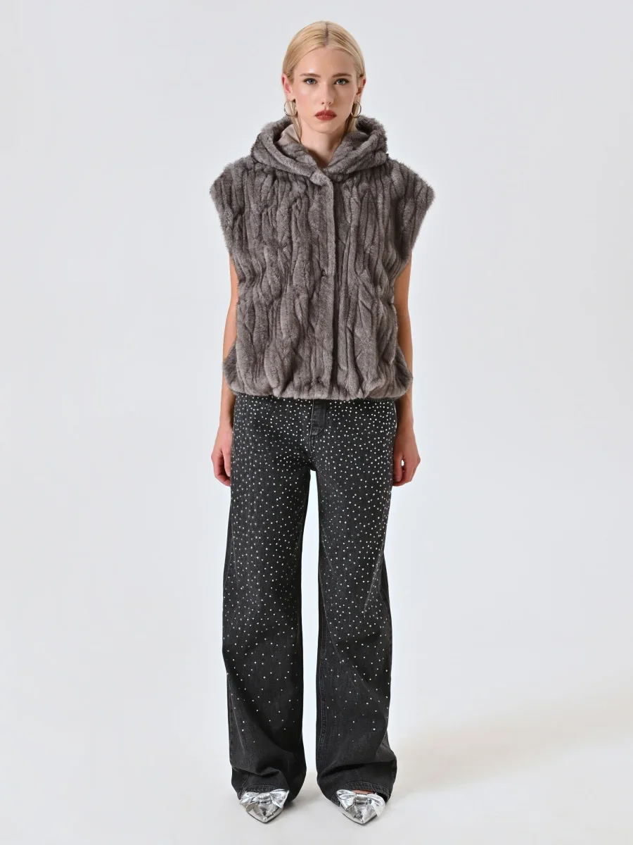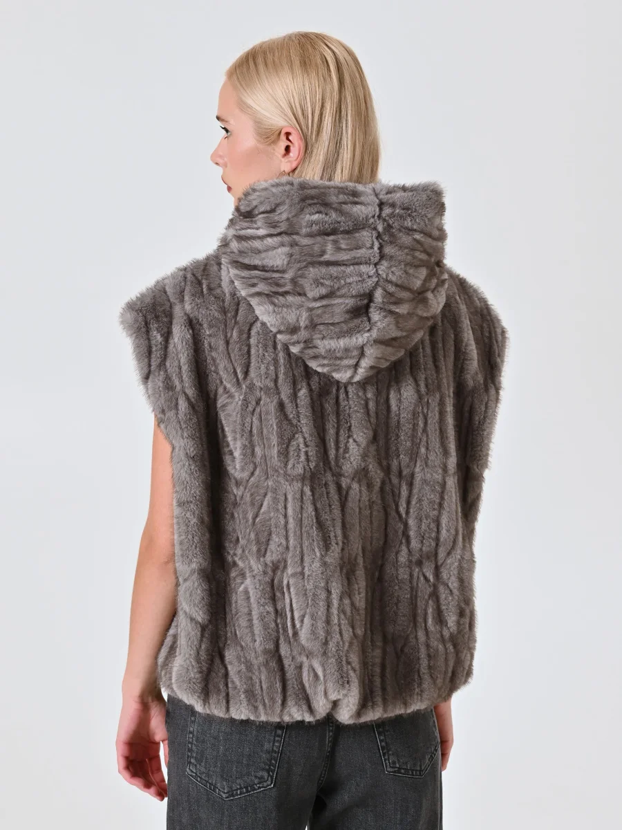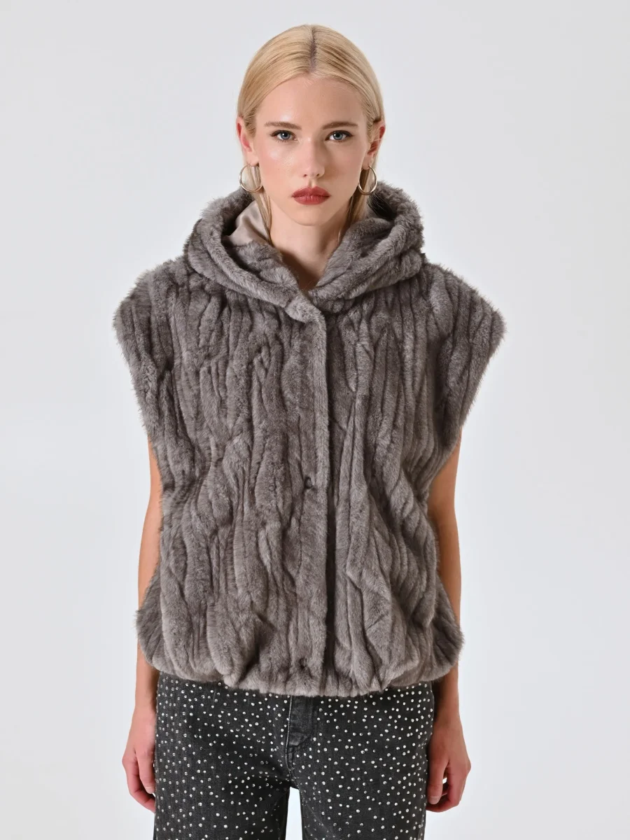 La Giacca smanicata in finta pelliccia con cappuccio è la scelta perfetta per distinguersi con un capo che unisce design, funzionalità e stile contemporaneo.