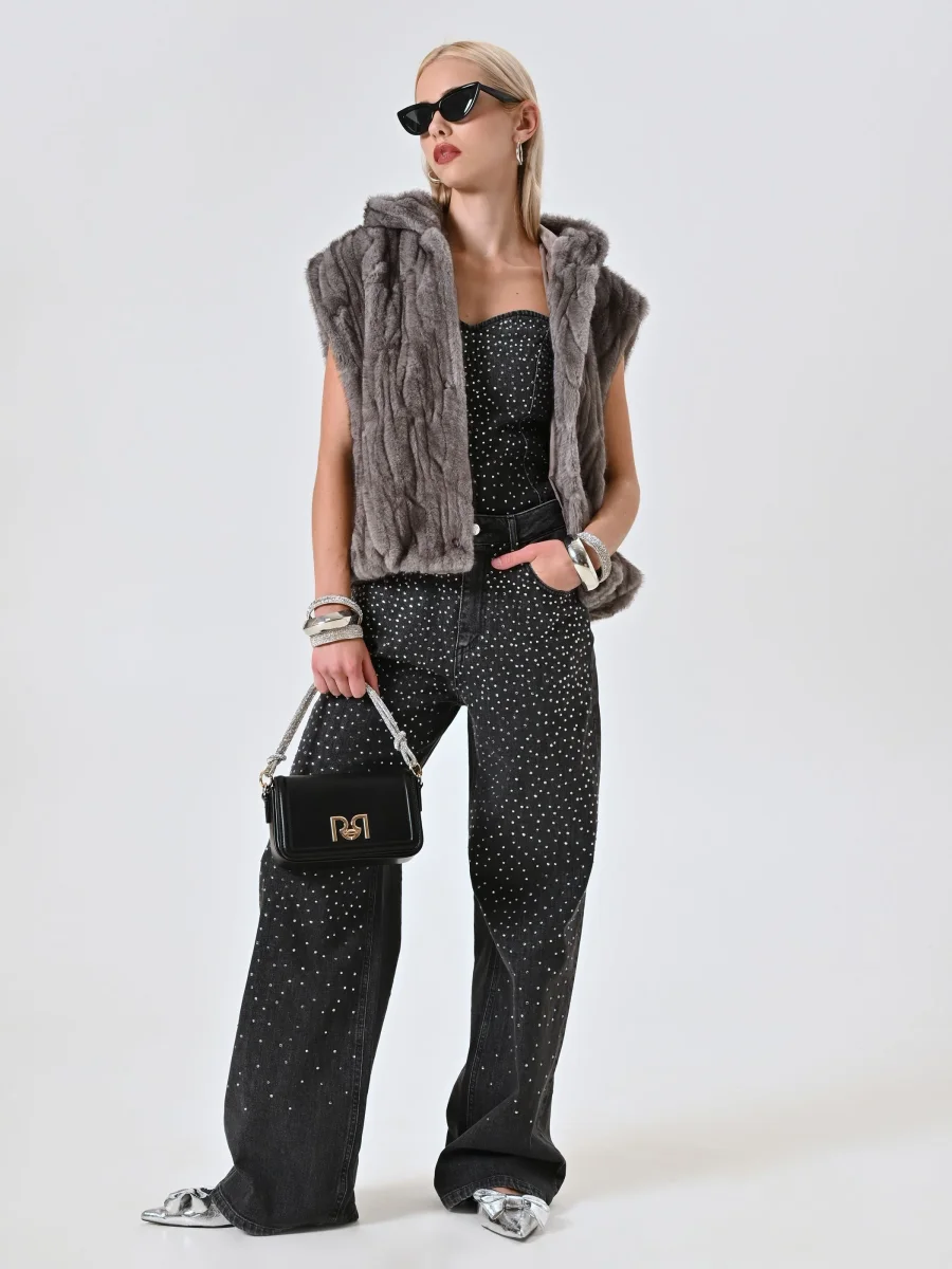 La Giacca smanicata in finta pelliccia con cappuccio è un capo dal fascino morbido e avvolgente, pensato per aggiungere comfort e stile alle giornate più fredde.