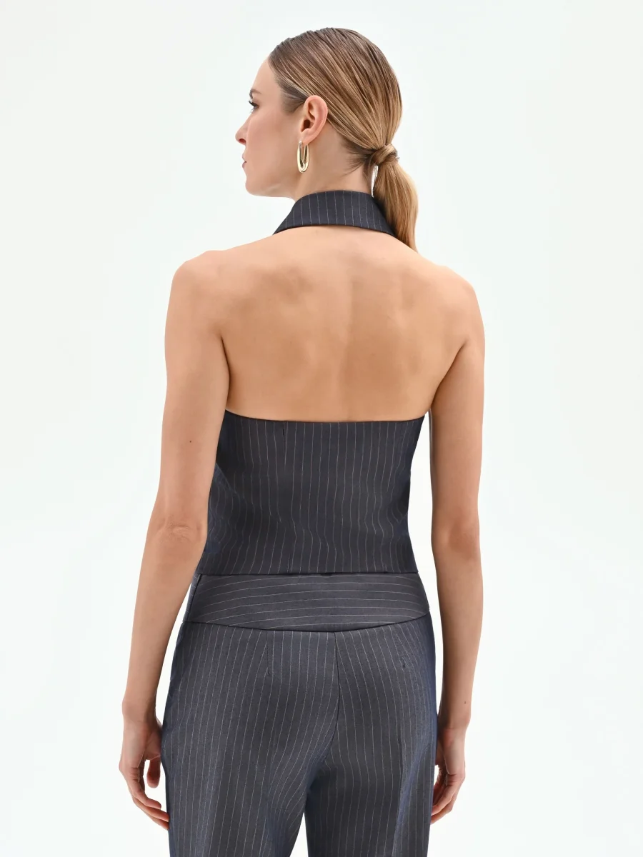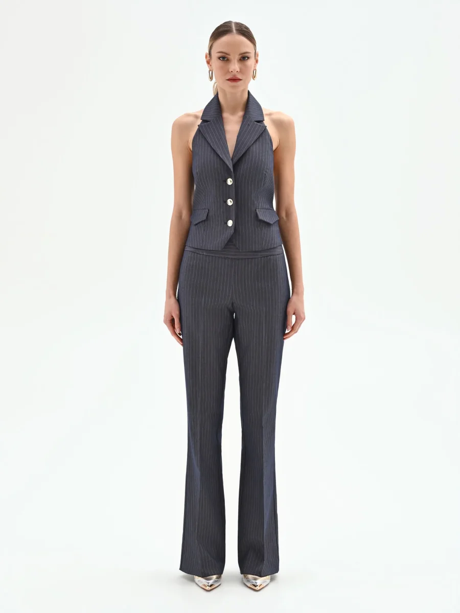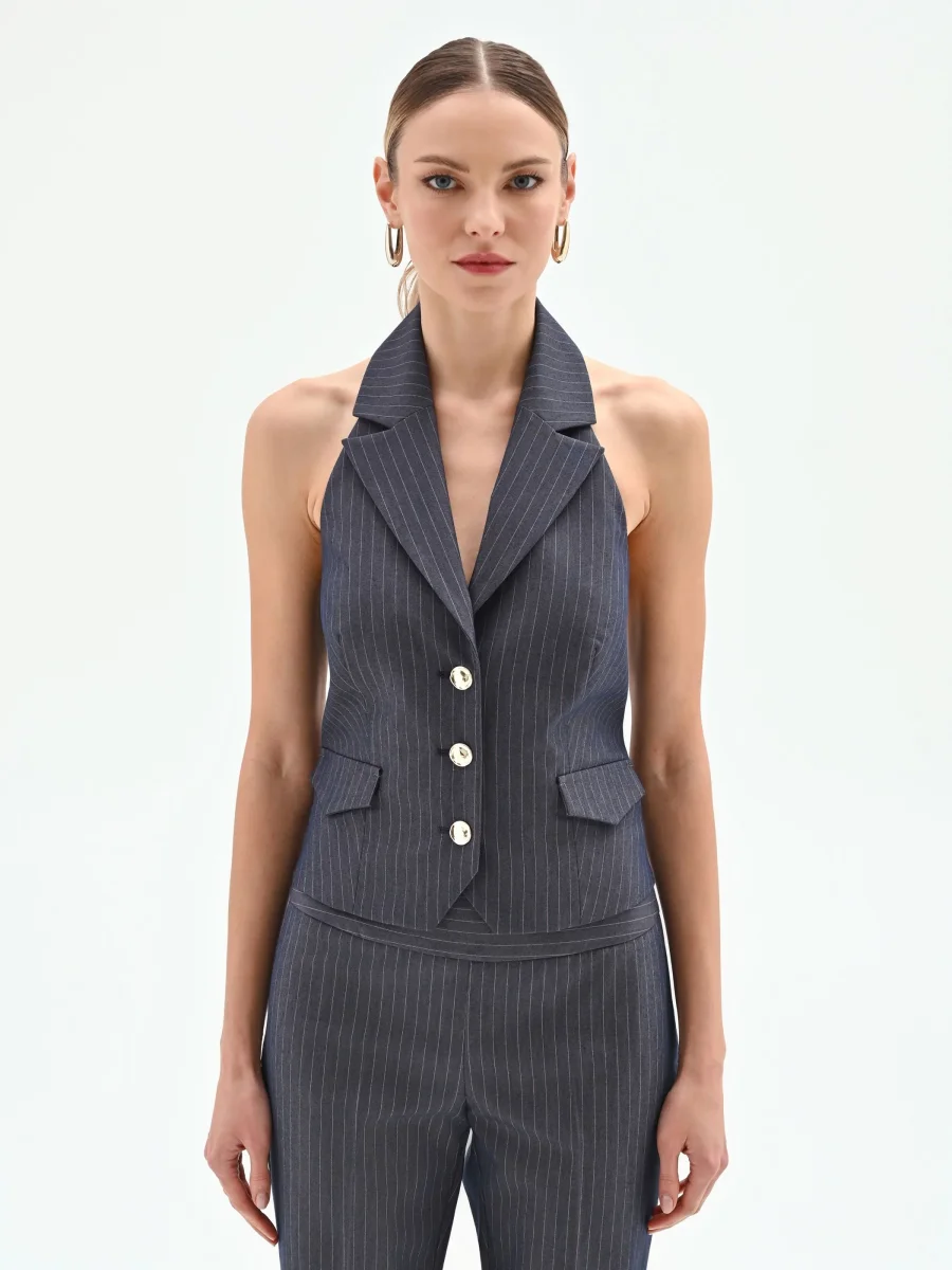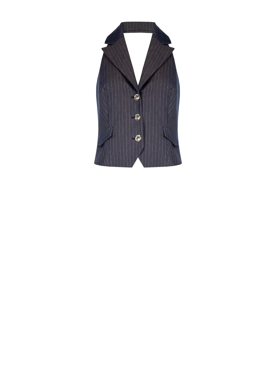 Una rilettura contemporanea del completo maschile, che trasforma il gessato in un simbolo di femminilità decisa e attuale. Questo gilet blu è un capo versatile dal design ricercato, perfetto per chi ama distinguersi con stile.