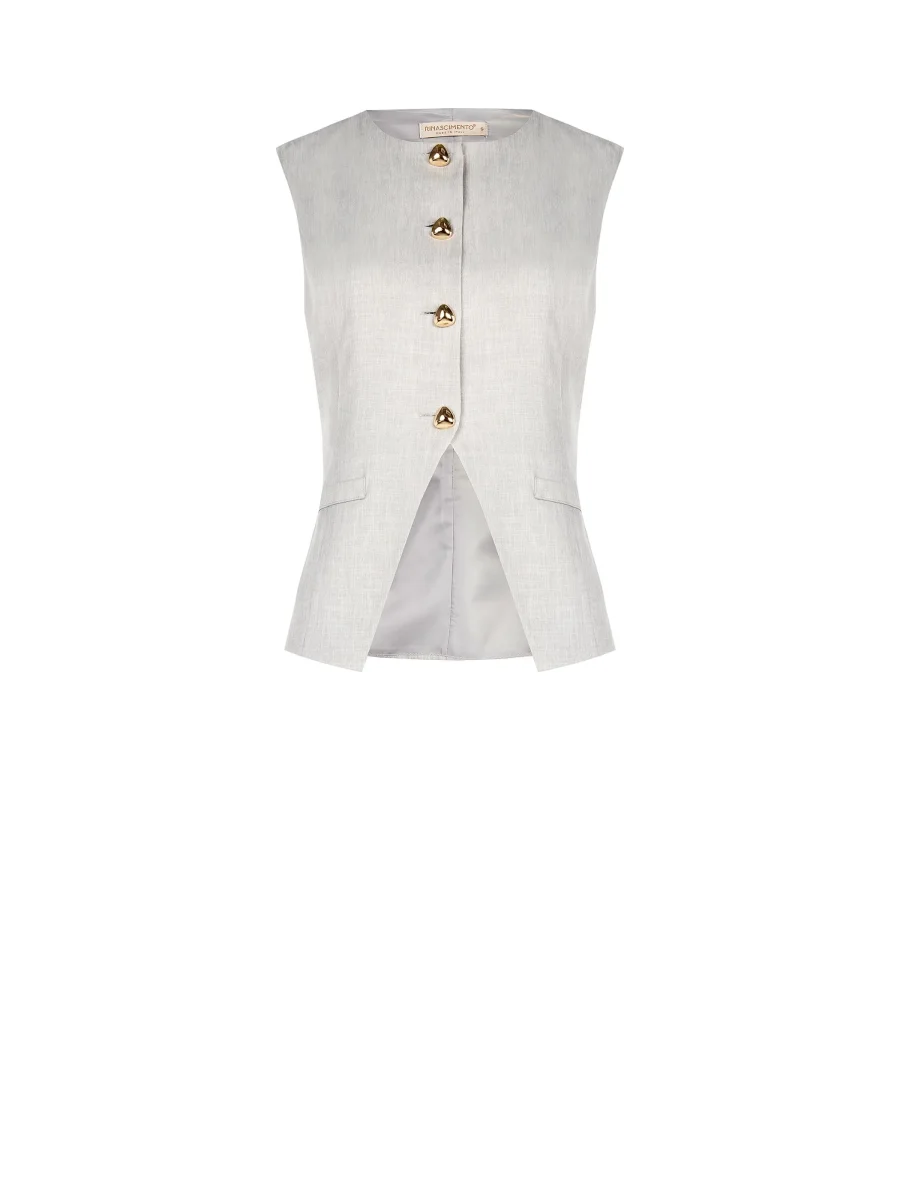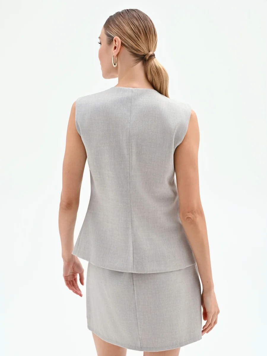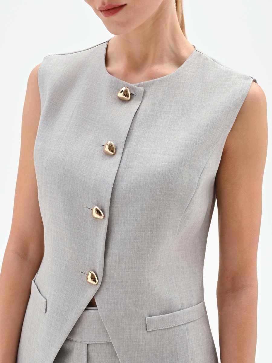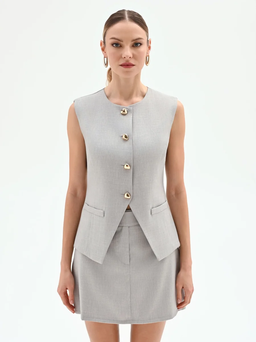 Il gilet grigio reinterpreta un classico del guardaroba con un design contemporaneo e dettagli ricercati, pensato per la donna che ama uno stile curato in ogni occasione. Realizzato in un confortevole tessuto misto lyocell e viscosa, la sua linea sciancrata segue e valorizza la silhouette con femminilità. Lo scollo rotondo e pulito introduce una chiusura frontale definita da quattro bottoni metallici dorati, caratterizzati da una forma irregolare e tridimensionale che agisce come un punto luce. Il design è reso unico dal fondo con taglio a punta sul davanti, che crea un movimento dinamico, mentre le due finte tasche a filetto richiamano un’eleganza più formale.