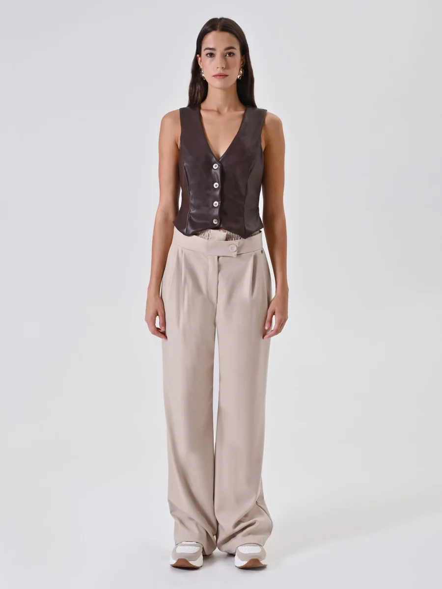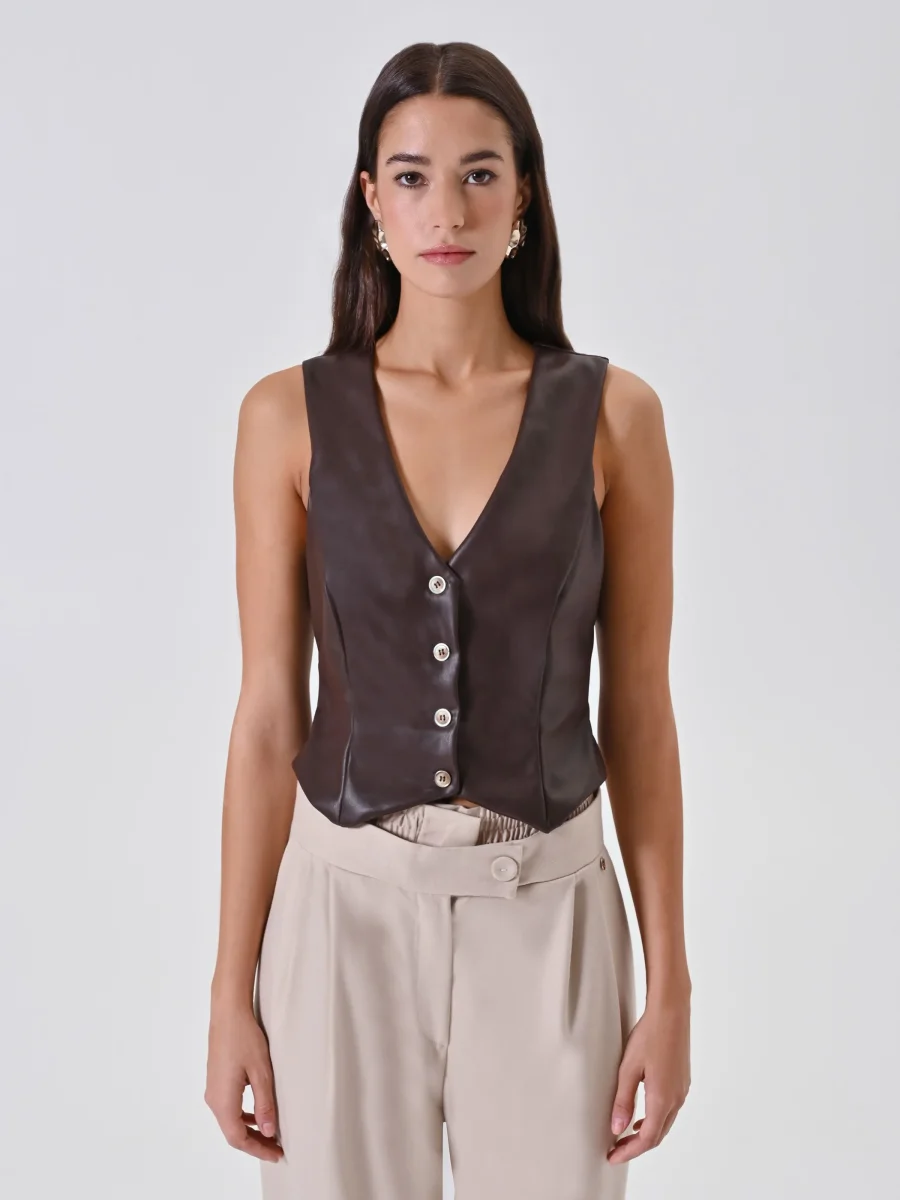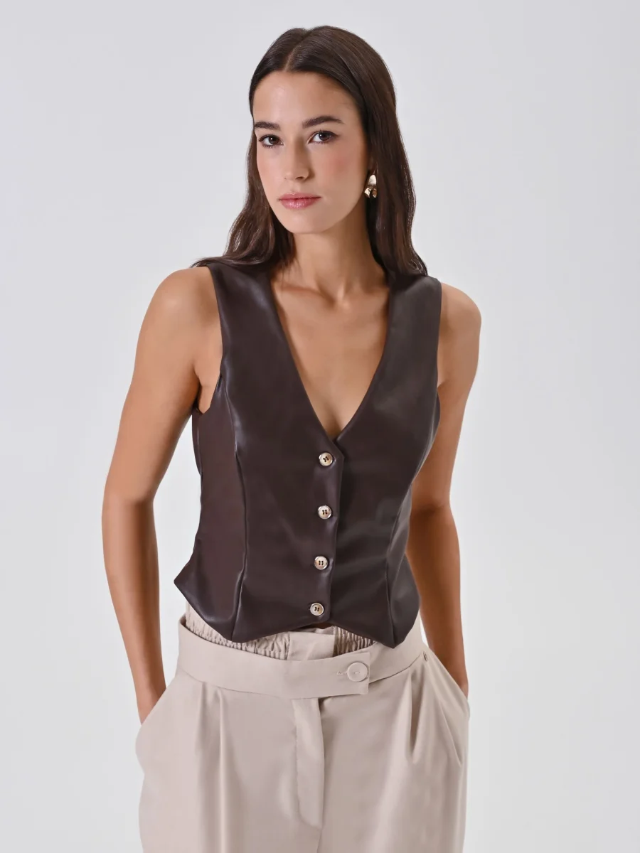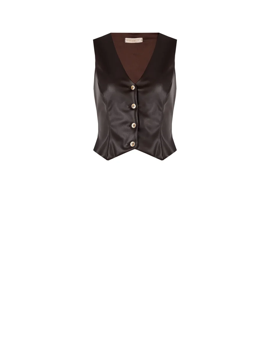 Il Gilet in Similpelle Marrone è un capo di tendenza che dona un tocco deciso e moderno a ogni outfit.