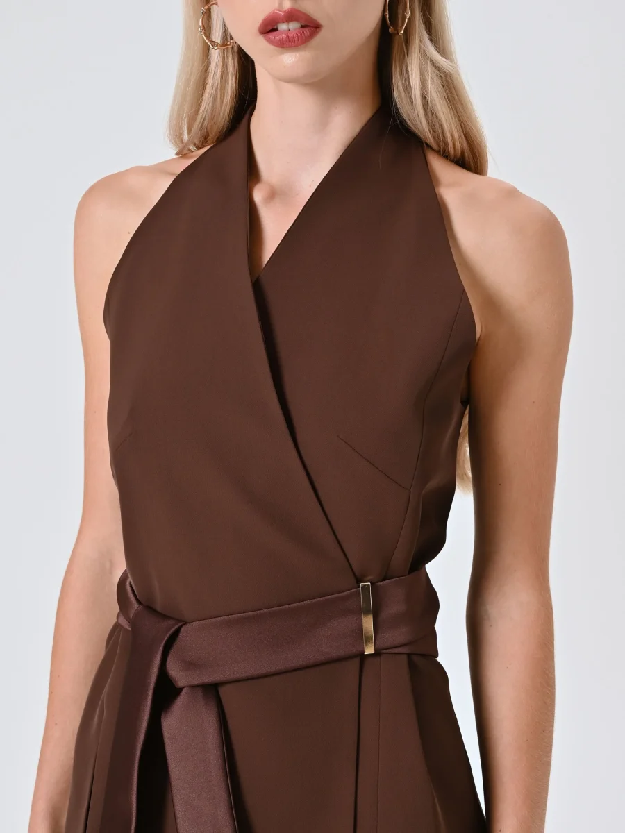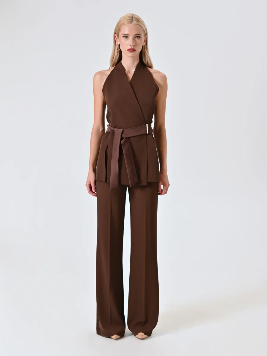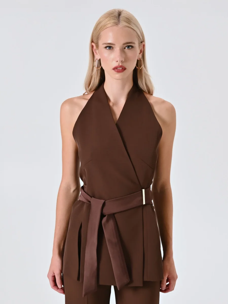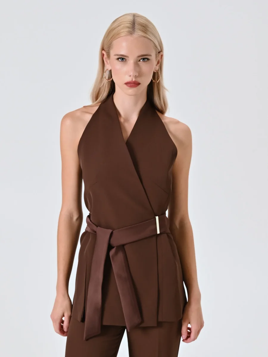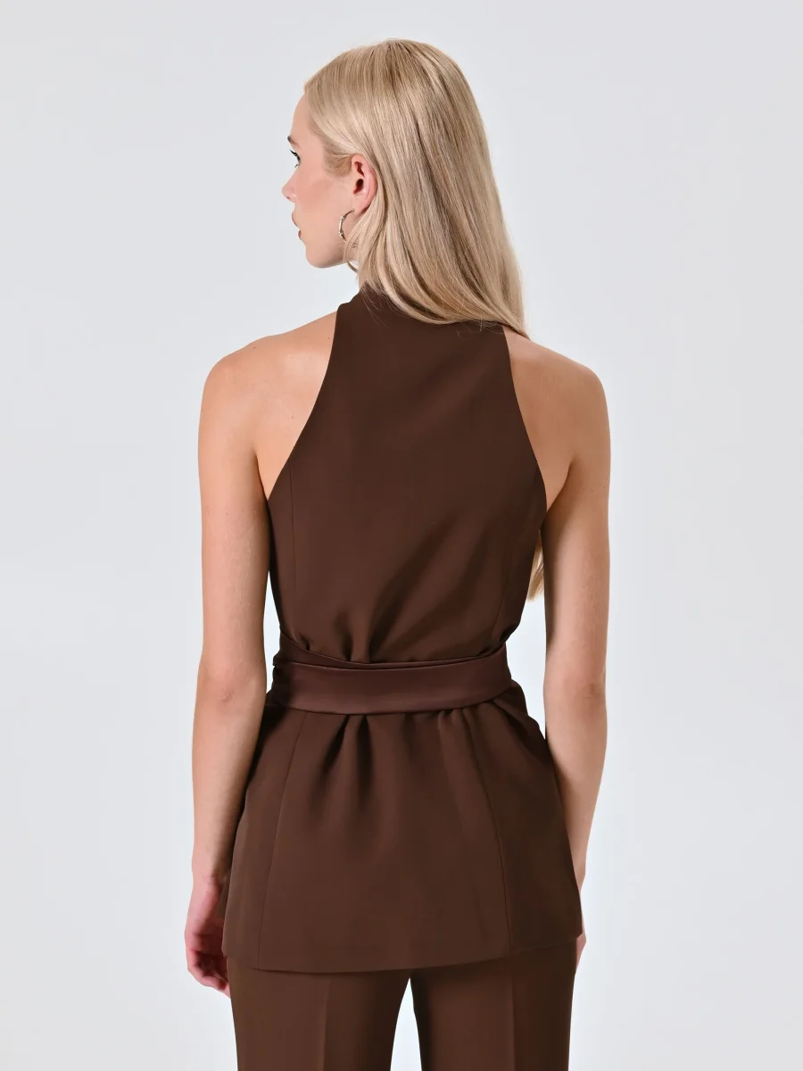 Il Gilet Marrone Cioccolato con Nastri in Raso è un capo raffinato e originale, pensato per valorizzare con stile ogni look da occasione.