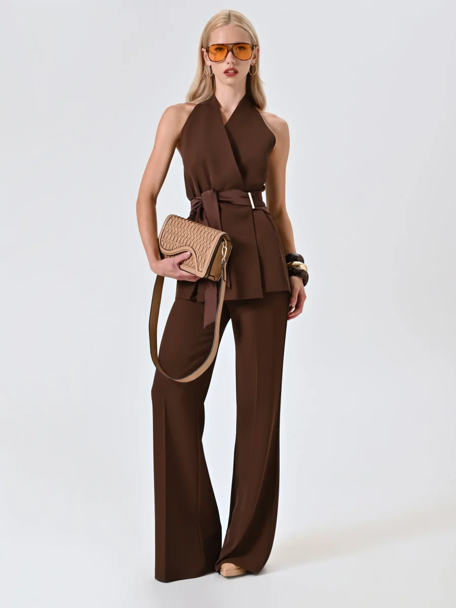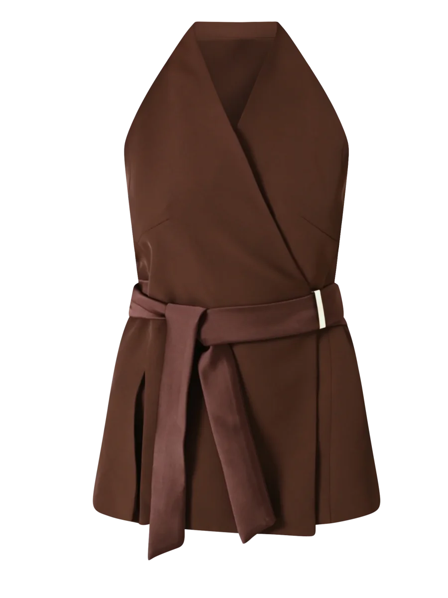 Realizzato in tessuto fluido con dettagli in raso, il Gilet Marrone Cioccolato con Nastri in Raso presenta uno scollo all’americana, spacchetti laterali e nastri in raso con fermaglio dorato che fungono da elegante chiusura.