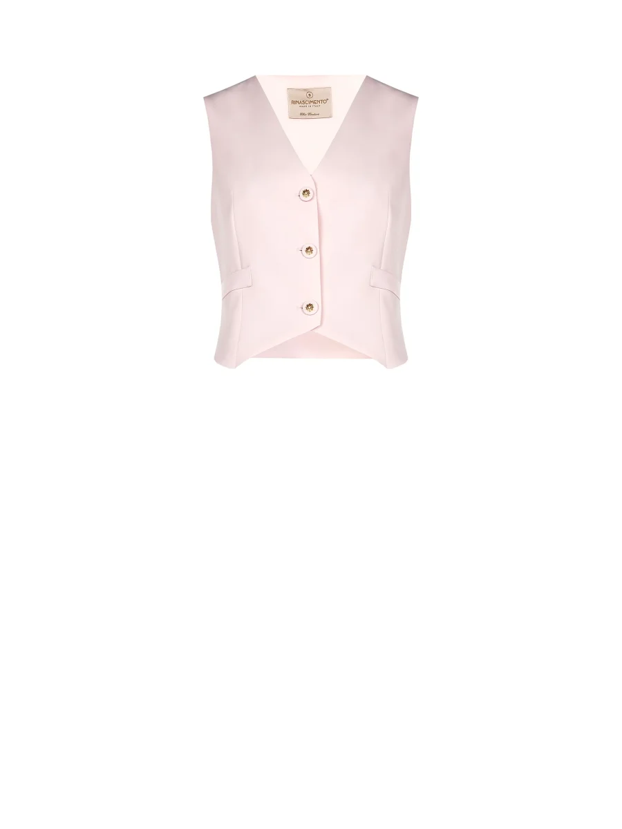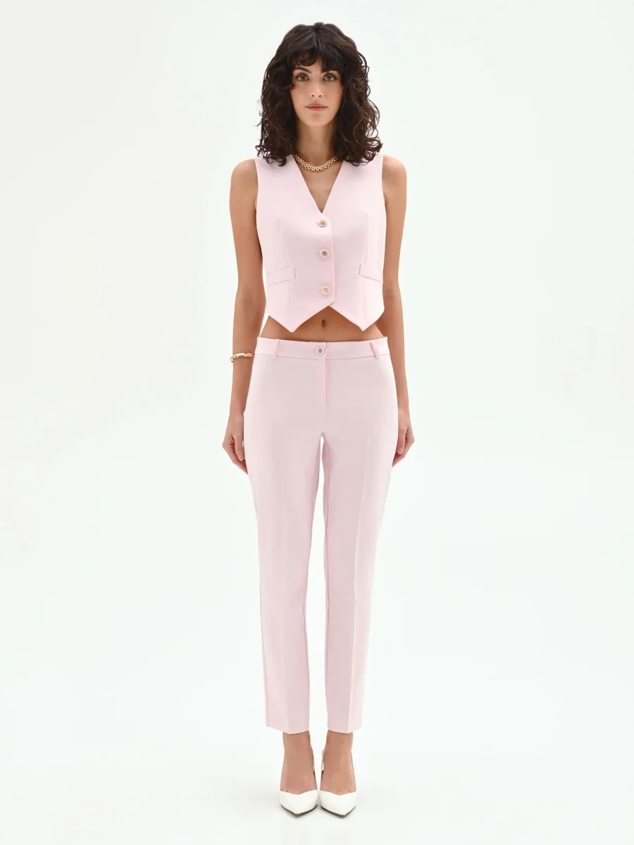 Una nota di colore delicata definisce la silhouette del gilet rosa pastello, un capo che unisce struttura e femminilità per interpretare i look da giorno con un tocco contemporaneo. Il suo design sciancrato e cropped è studiato per valorizzare la figura, mentre il tessuto tecnico assicura una vestibilità confortevole e una linea sempre definita. Lo scollo a V slancia il busto e si abbina alla chiusura monopetto con tre bottoni dorati, che aggiungono un dettaglio luminoso. Il fondo sagomato a due punte e le finte tasche a filetto con patta sono dettagli che arricchiscono il modello, conferendogli un carattere unico. Questo gilet è pensato per essere il cuore di un completo sofisticato: indossalo con la giacca (cod. CFC0127868003) e i pantaloni coordinati (cod. CFC0127894003) per un total look adatto all’ufficio o a una cerimonia informale. Portato da solo sopra una camicia, diventa protagonista di un outfit più creativo e personale.