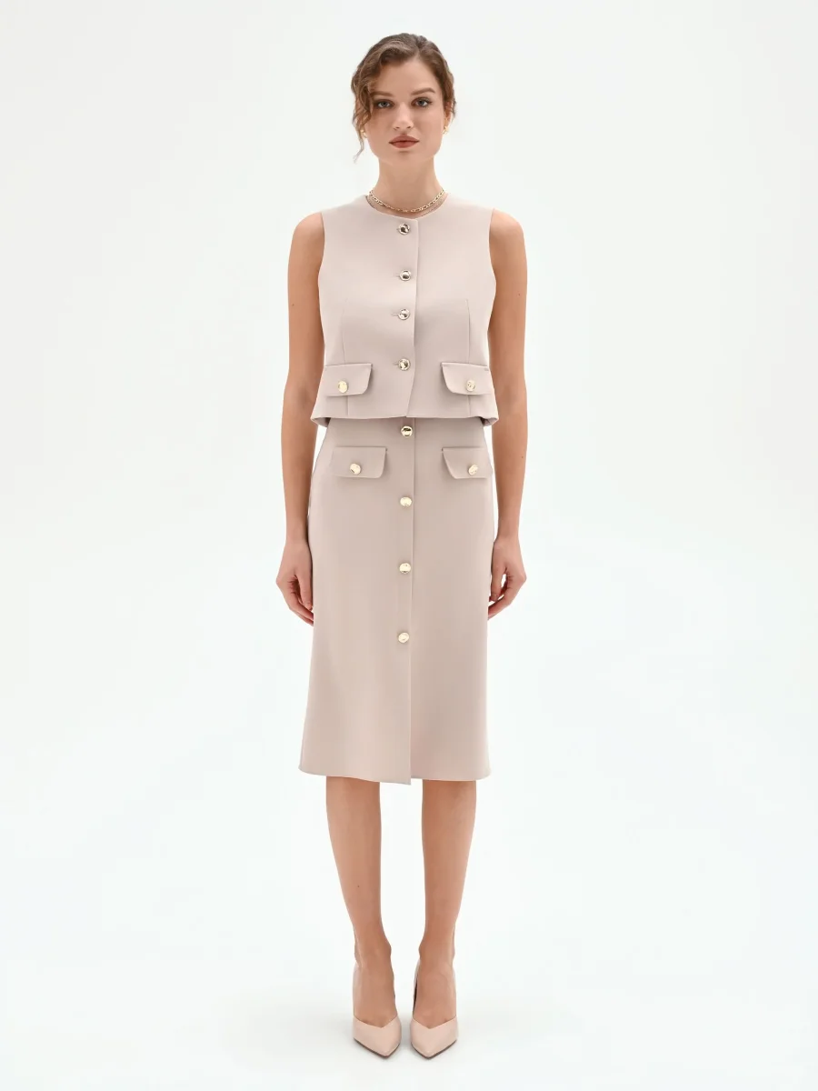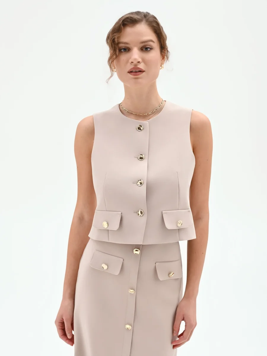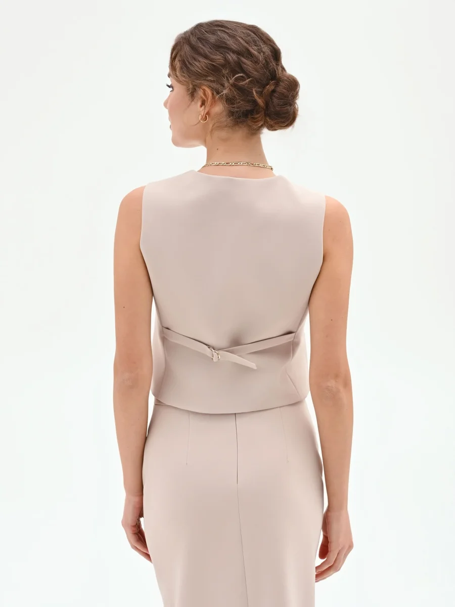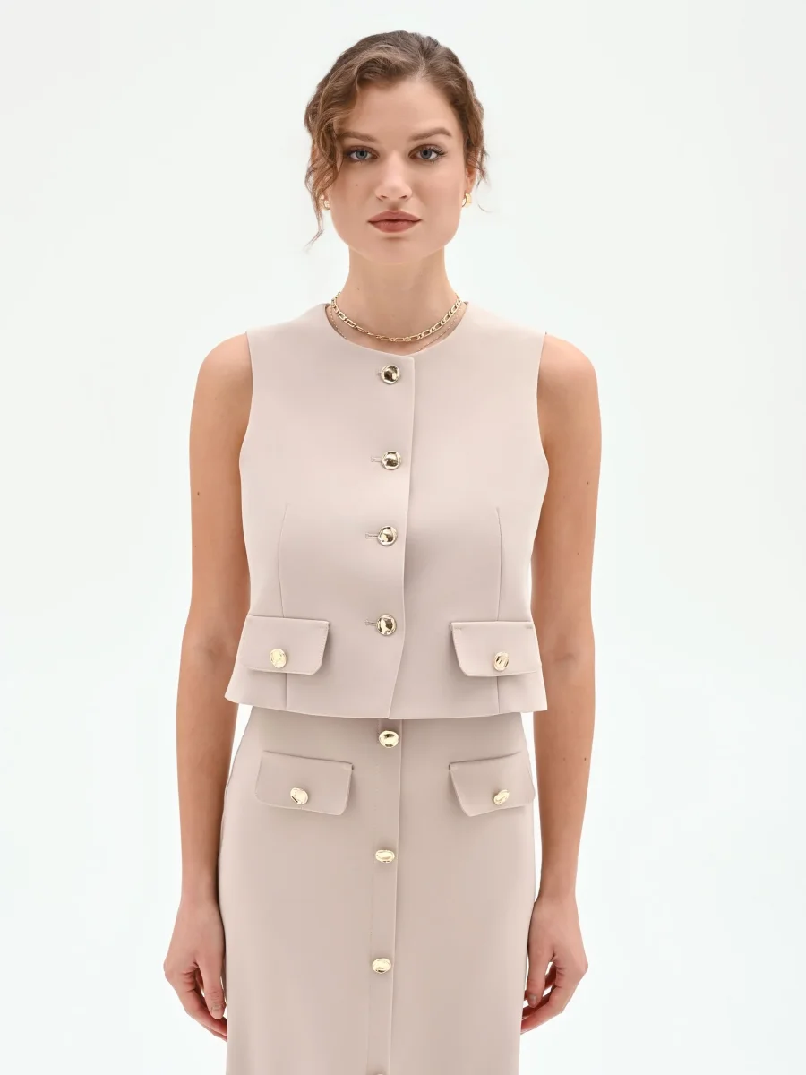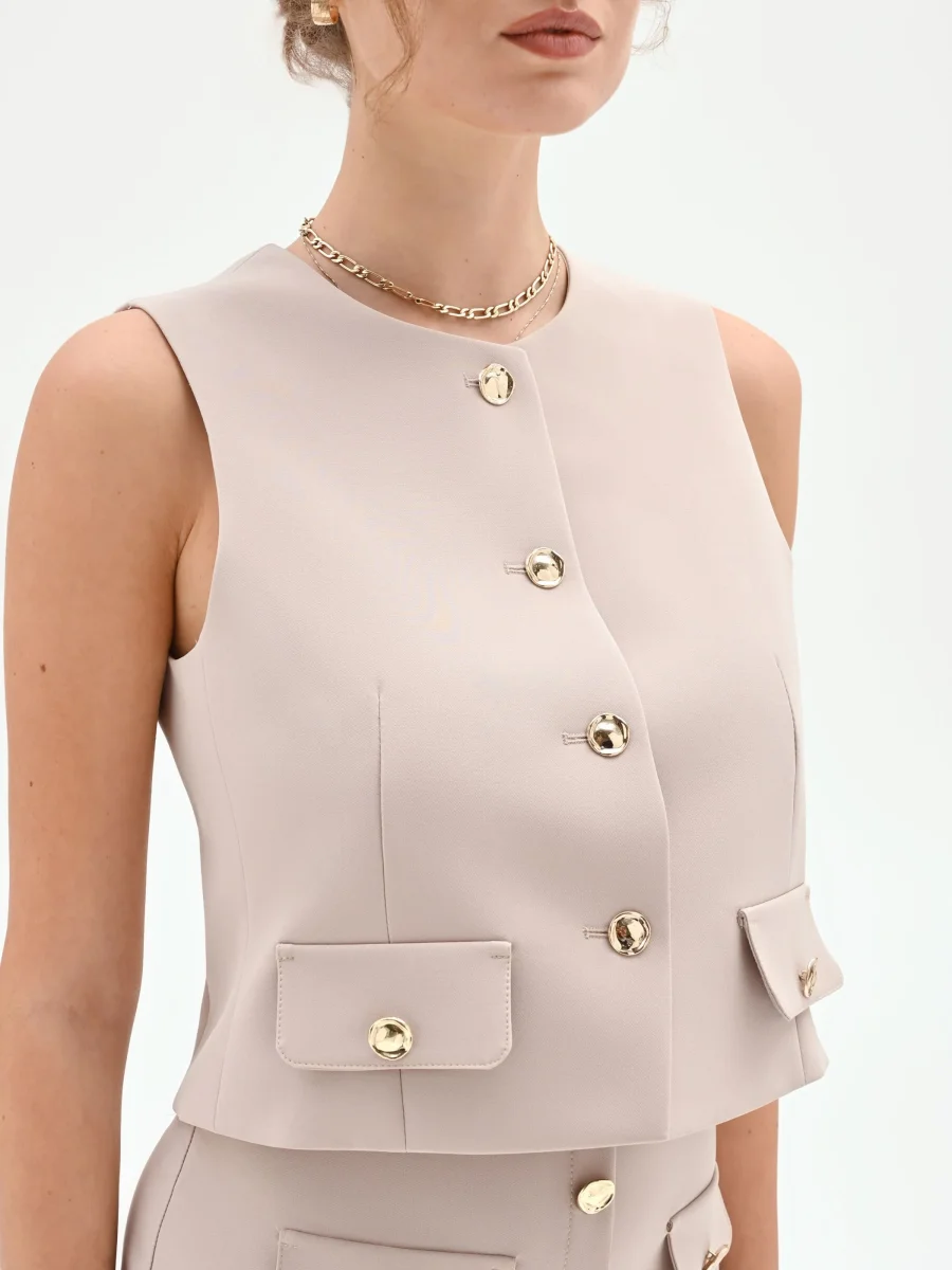 Un gioco di geometrie essenziali e contemporanee disegna il gilet tortora beige, un capo versatile pensato per la donna che ama uno stile ricercato e funzionale.
