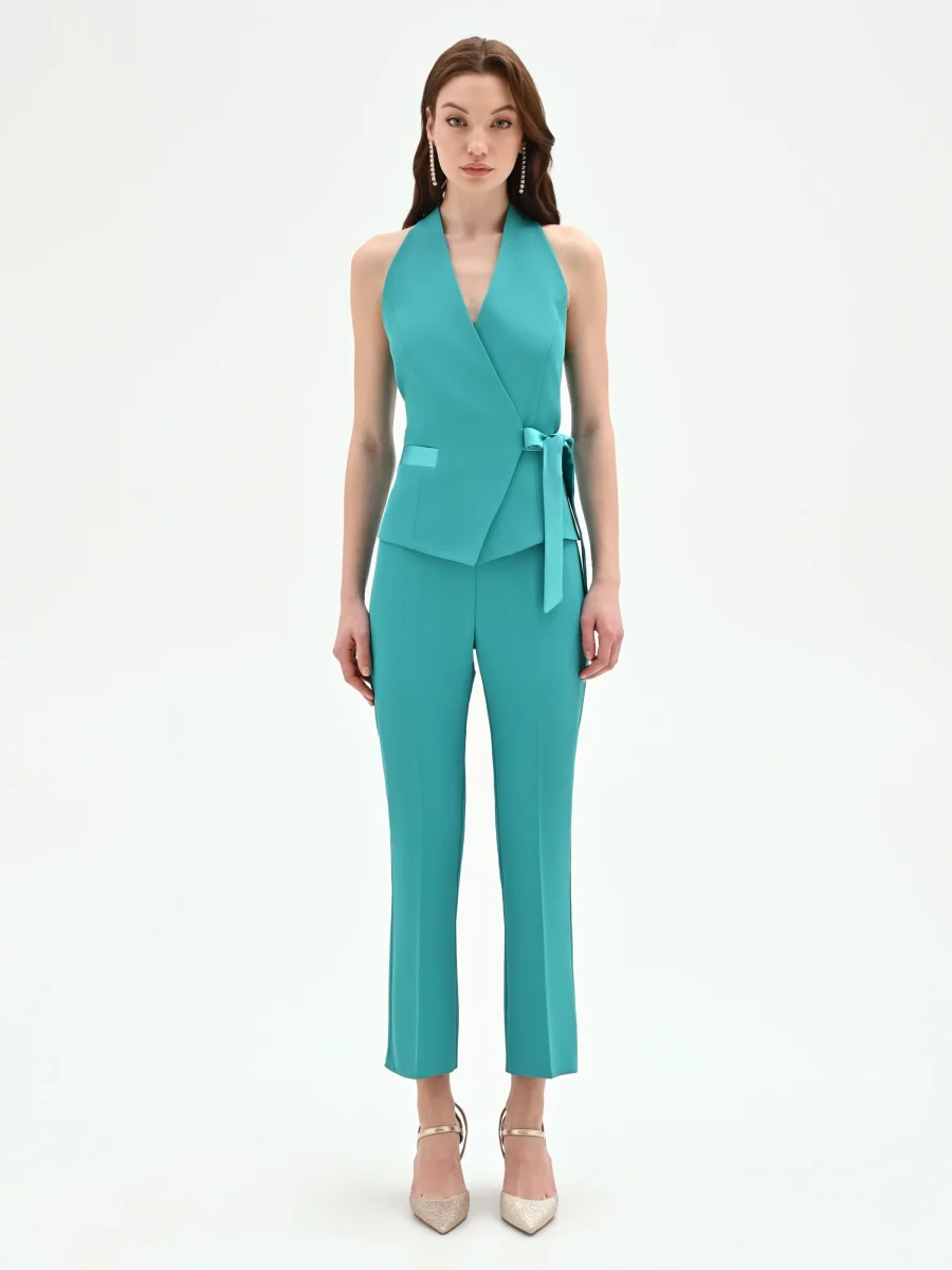 Un gioco di geometrie e una tonalità vibrante definiscono il gilet turchese azzurro, un capo dalla personalità decisa pensato per look contemporanei. Realizzato in cadi, il modello presenta una silhouette sciancrata che valorizza la figura. Lo scollo all’americana si apre sul davanti in una profonda scollatura a V, aggiungendo un tocco di audace femminilità. Il design è a portafoglio, con un incrocio asimmetrico dei pannelli frontali che si chiudono sul fianco grazie a un nastro effetto fusciacca da annodare in vita. Un raffinato dettaglio di tasca a filetto con profilo lucido tono su tono arricchisce il design. Perfetto per creare un completo dall’allure sofisticata, si abbina al pantalone della stessa linea (codice CFC0129010003B077). Indossalo per un impegno di lavoro importante o per un evento diurno che richiede un’eleganza non convenzionale, completando il look con accessori minimal.