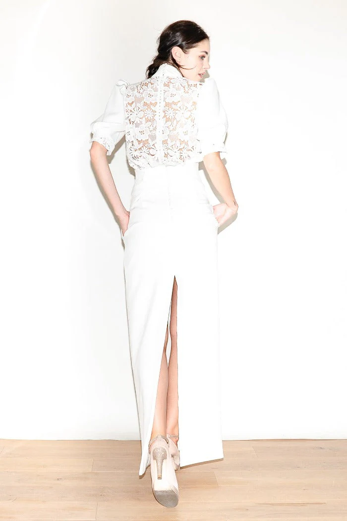 – Crêpe de soie 100% soie, Guipure et doublure 100% soie