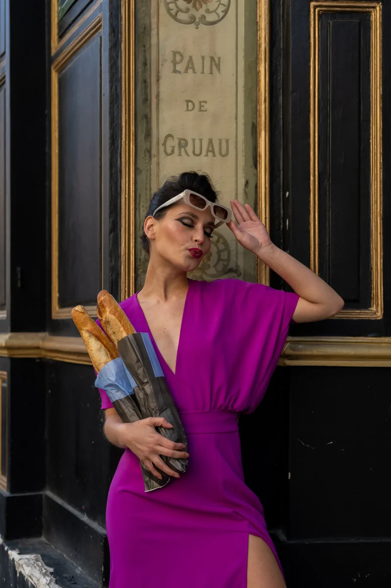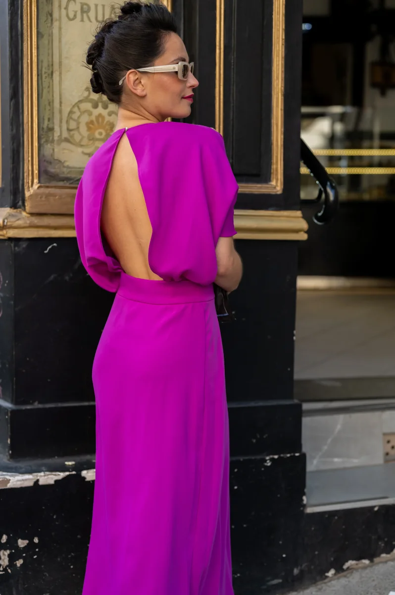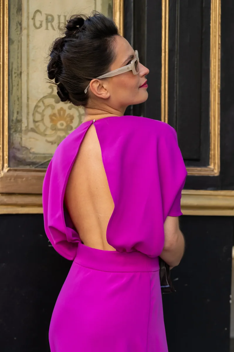 L’ensemble se compose d’un top violet aux manches chauve-souris, offrant fluidité et aisance, et d’une jupe midi fendue sur le devant qui dévoile subtilement la jambe tout en ajoutant un aspect dynamique. Le décolleté du top apporte une touche d’élégance à l’avant et au dos. La couleur violet intense ajoute une touche royale et sophistiquée à l’ensemble, le rendant idéal pour des évènements formels ou des soirées élégantes.