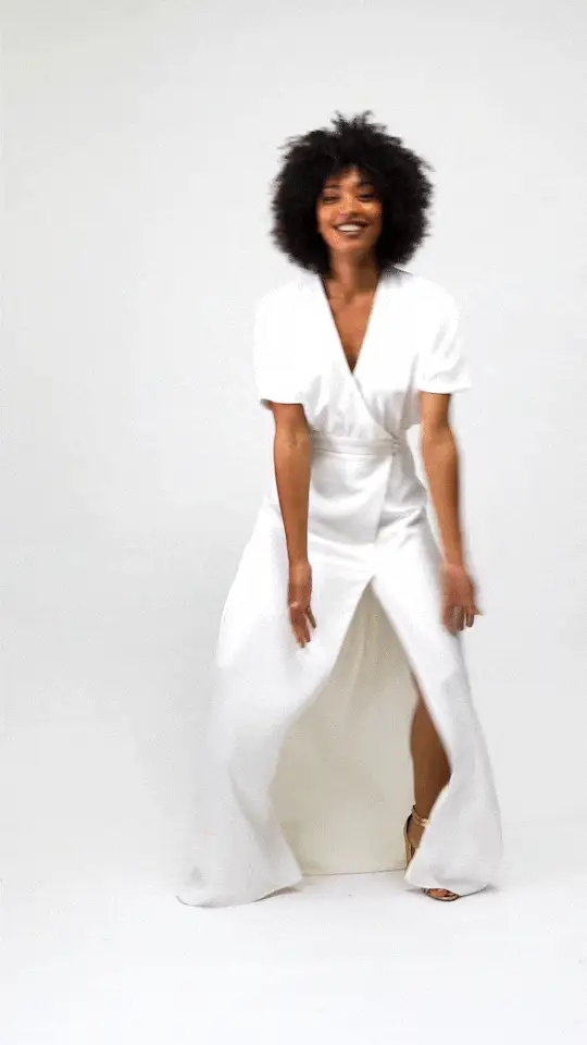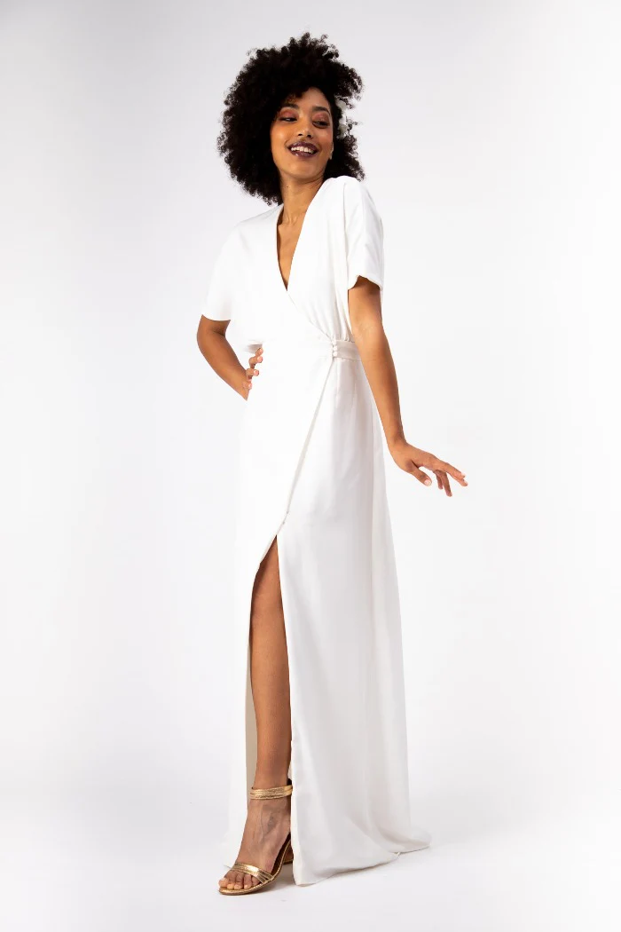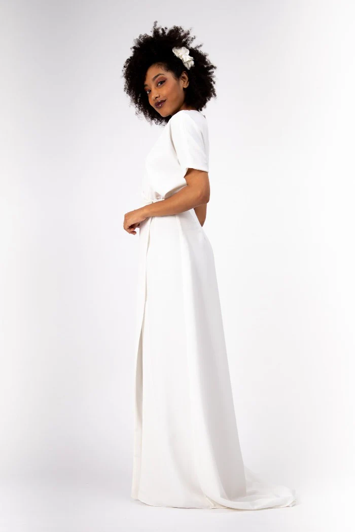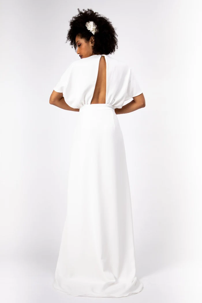 Robe longue avec traine, forme cache-coeur, boutonnée devant, manches chauve-souris et dos nu.