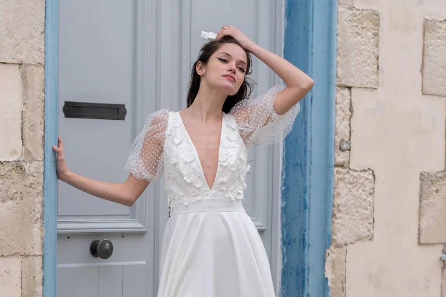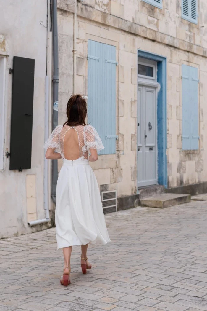 Fabriqué en France Prêt à porter : dès 800€Sur-mesure : dès 1100€ Description Jolie robe longueur midi avec son décolleté plongeant en dentelle et plumetis et son dos ouvert tout en subtilité laissant apparaître une partie du dos. Tissus : – Polyester 100%. Doublure Polyester – Dentelle – Tulle Plumetis Calixte mesure 1,72m et porte […]