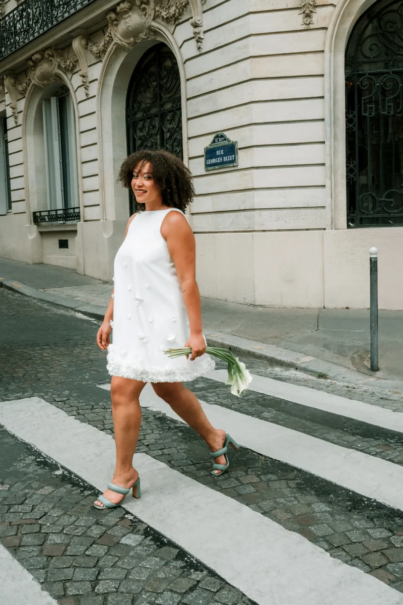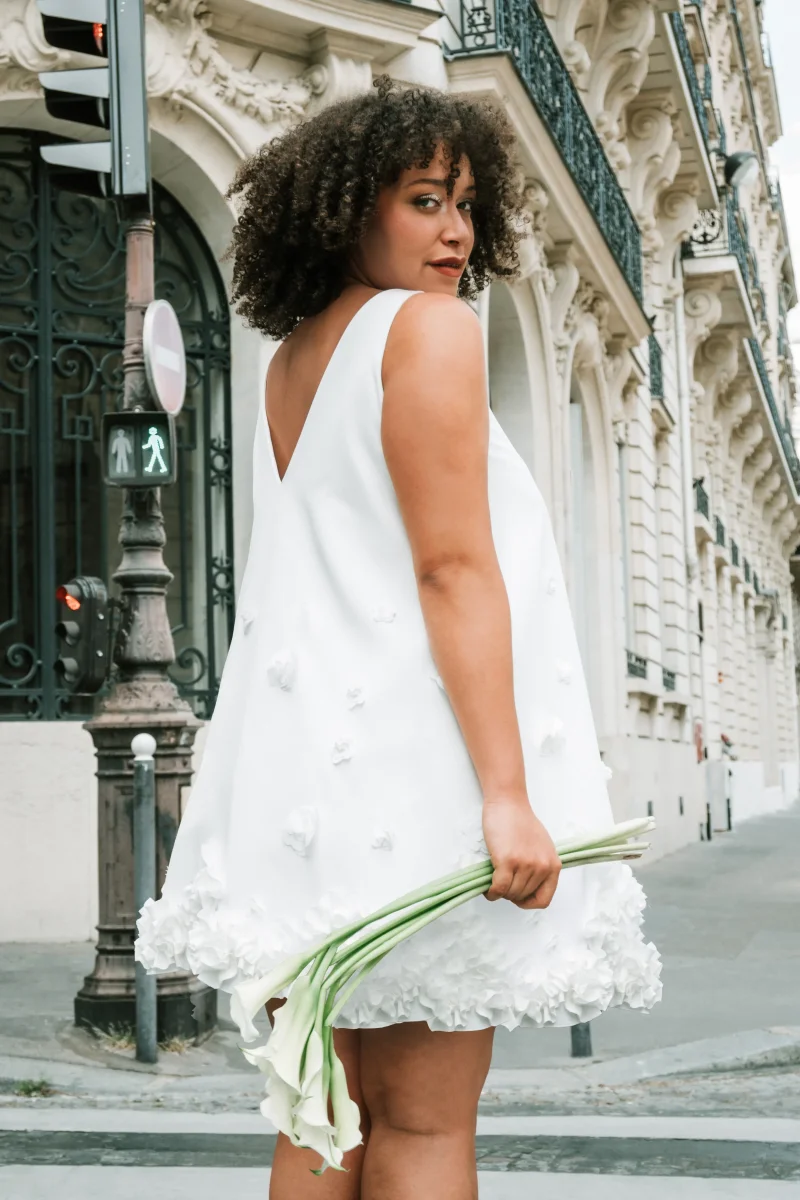 Pour un mariage civil aussi léger que stylé, laissez-vous séduire par cette robe courte, évasée et délicatement espiègle. Avec ses fleurs brodées à la main et son design chic, elle est parfaite pour les mariées modernes en quête de simplicité raffinée. 🌸✨