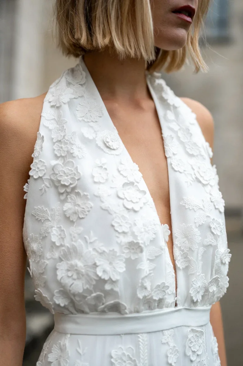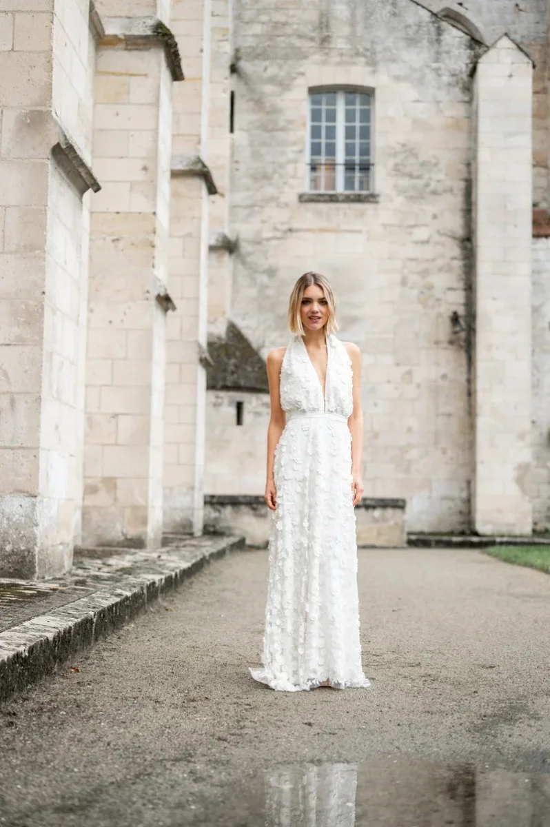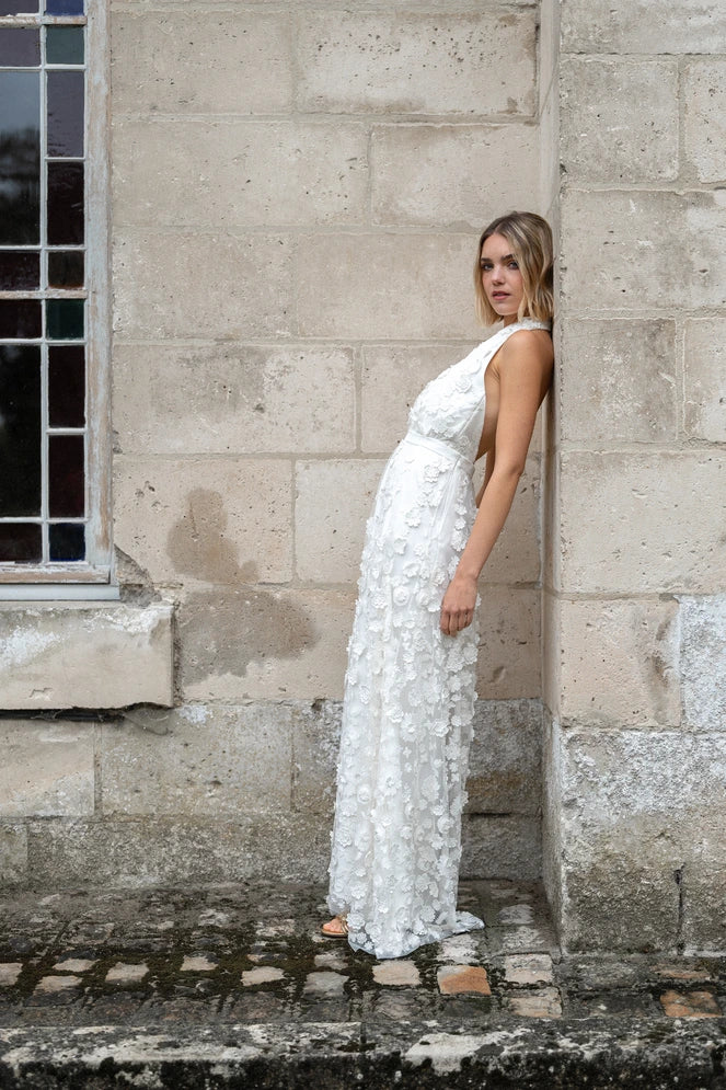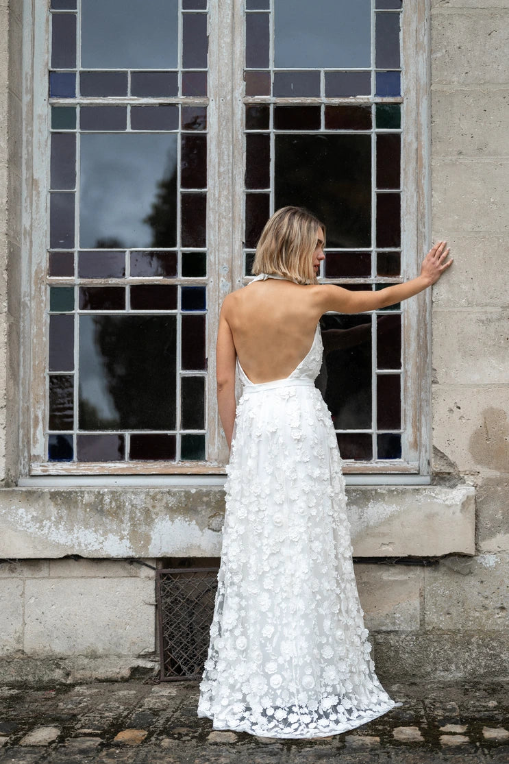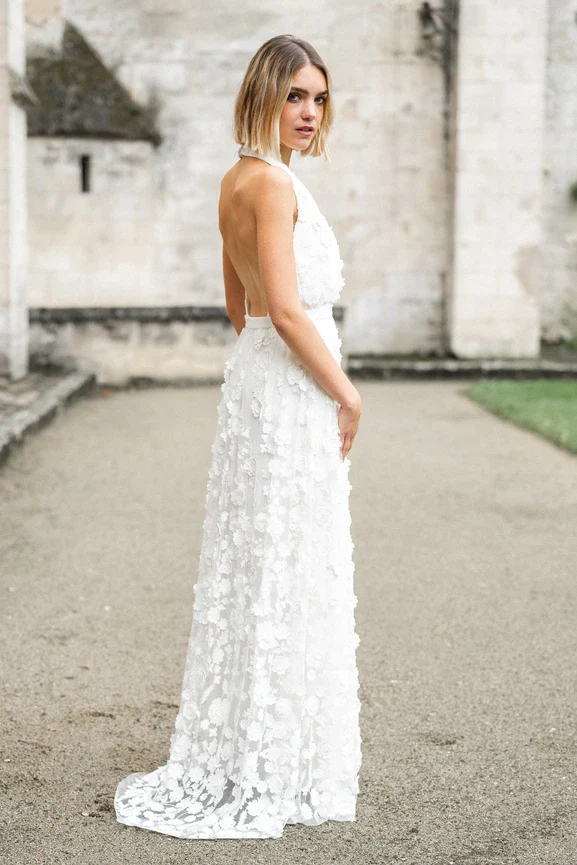 Apportez une touche de magie à votre grand jour avec cette robe de mariage unique et raffinée, confectionnée en tulle brodé de fleurs en relief. Chaque détail crée une texture captivante, ajoutant un effet visuel saisissant à l’ensemble de la robe. La forme élancée sublime votre silhouette, tandis que le grand dos nu et le décolleté plongeant apportent une touche audacieuse et moderne.