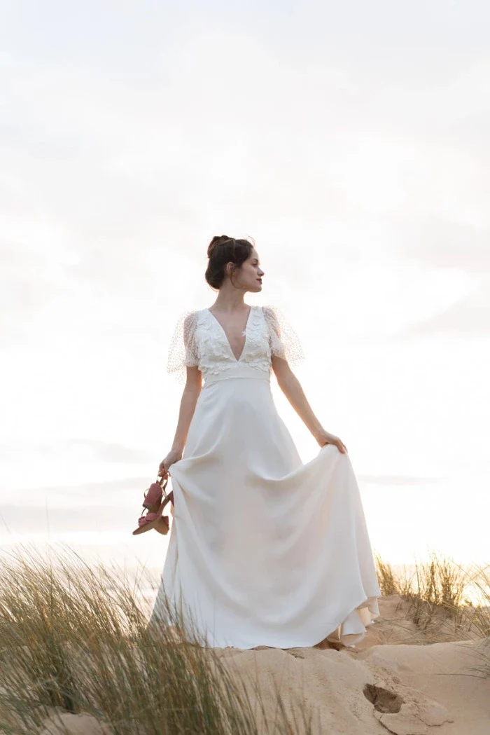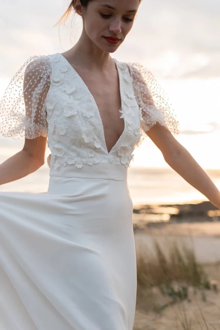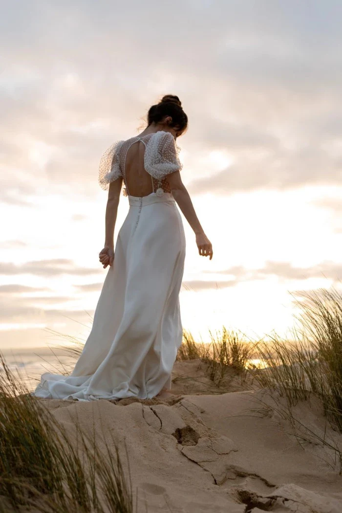 Robe longue avec son superbe top en jacquard à décolleté plongeant et ses manches ballon en plumetis sans oublier ce dos subtilement découvert.