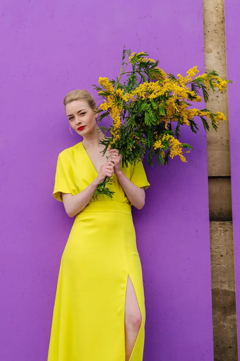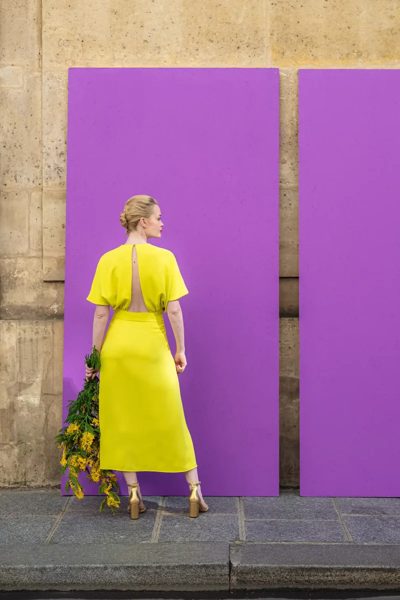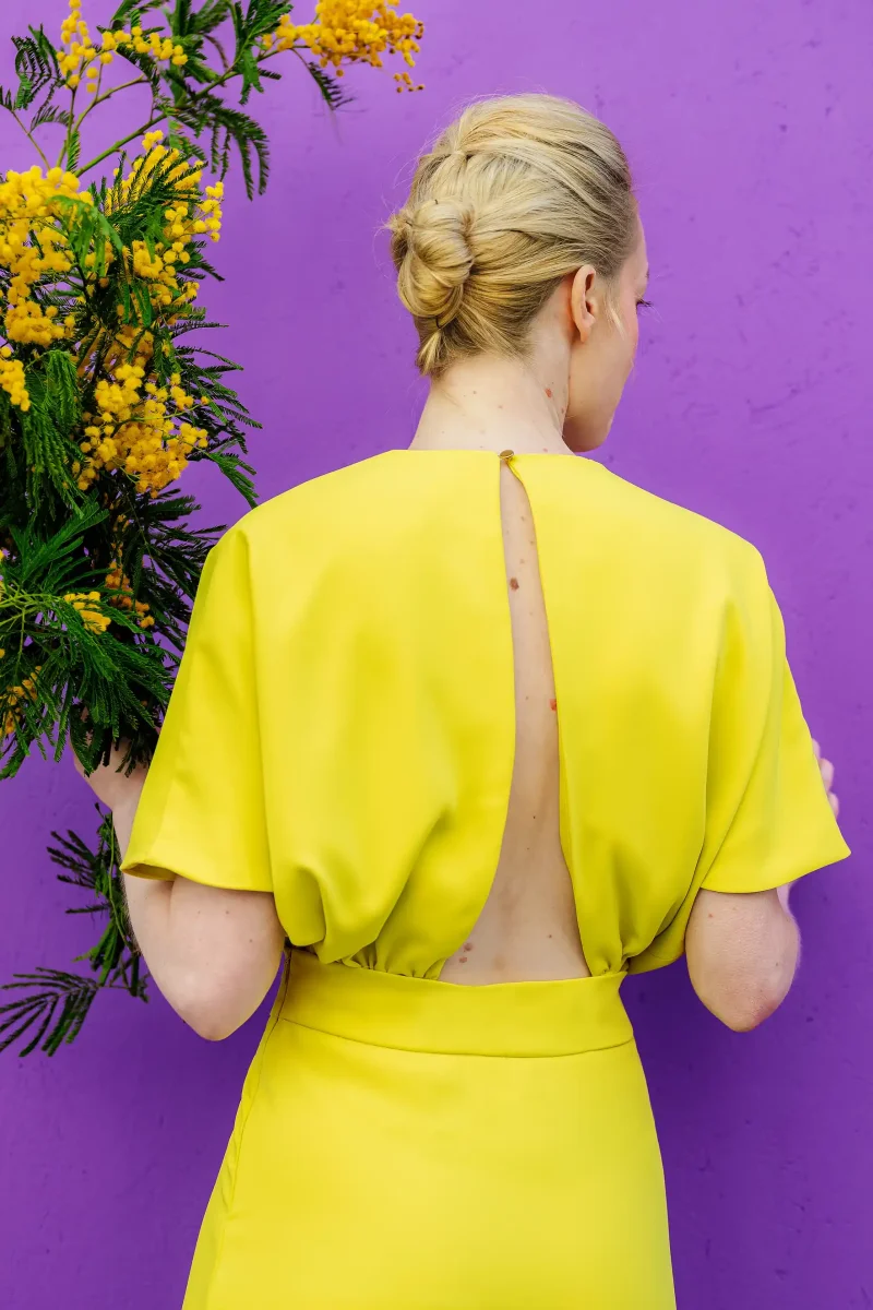 Ce look solaire en jaune éclatant va faire des étincelles : un ensemble top + jupe, pour briller avec style lors d’un mariage civil, d’une cérémonie estivale ou d’un cocktail chic.