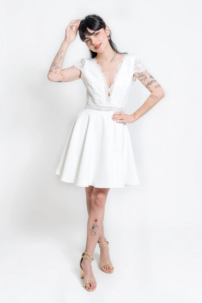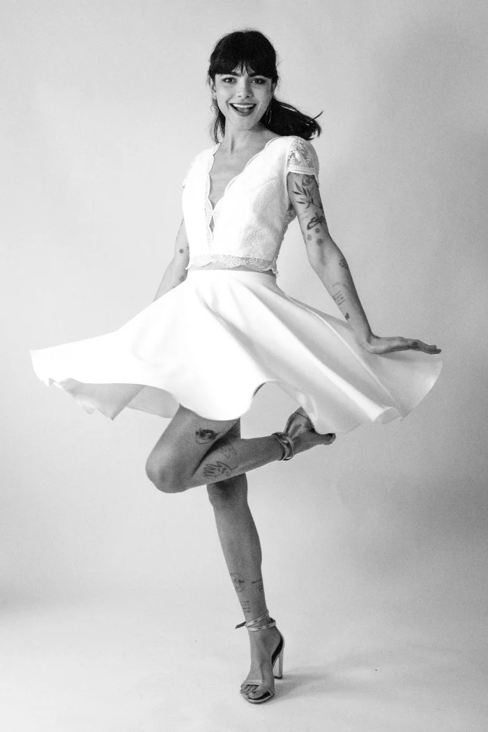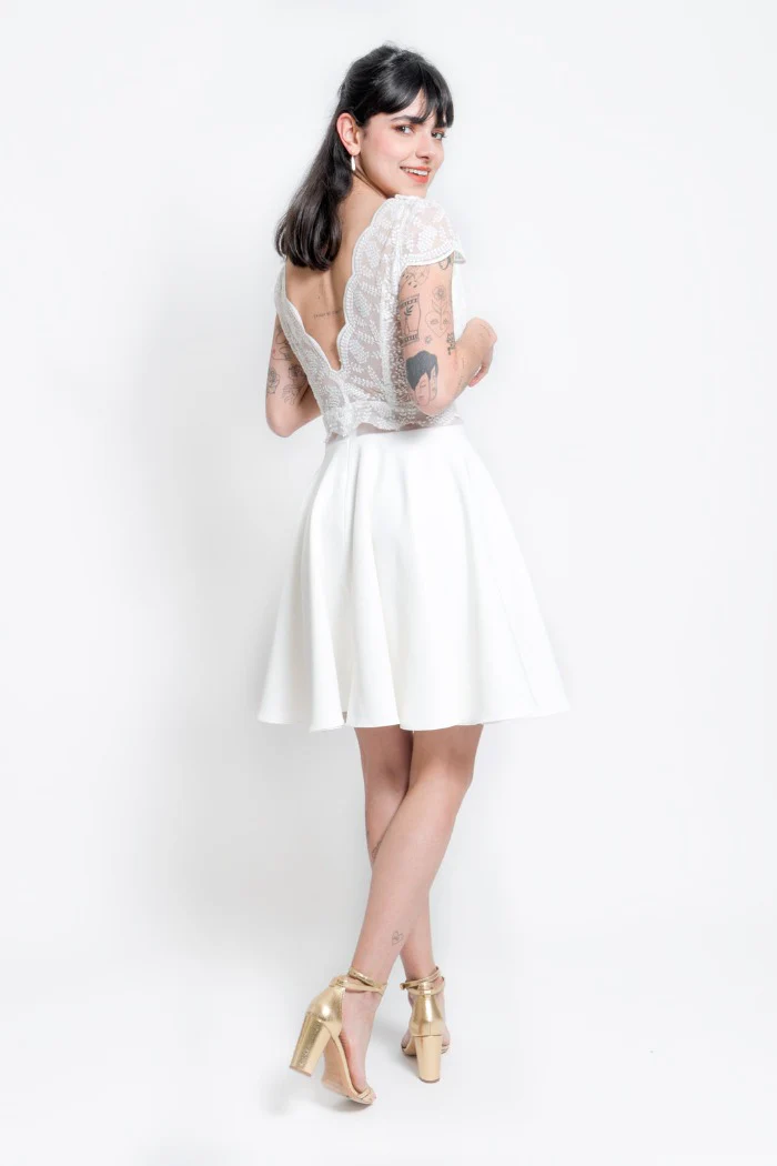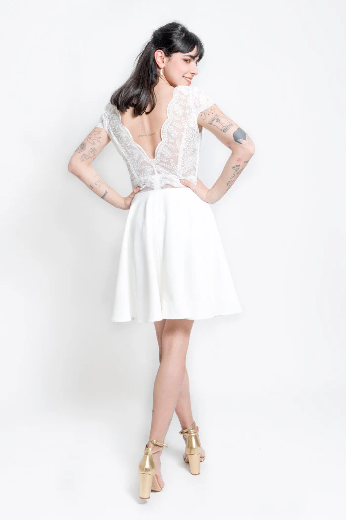 Robe jupe patineuse taille haute et haut dentelle, mancherons, décolleté plongeant devant et dos.