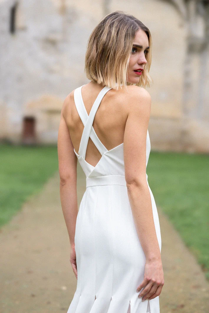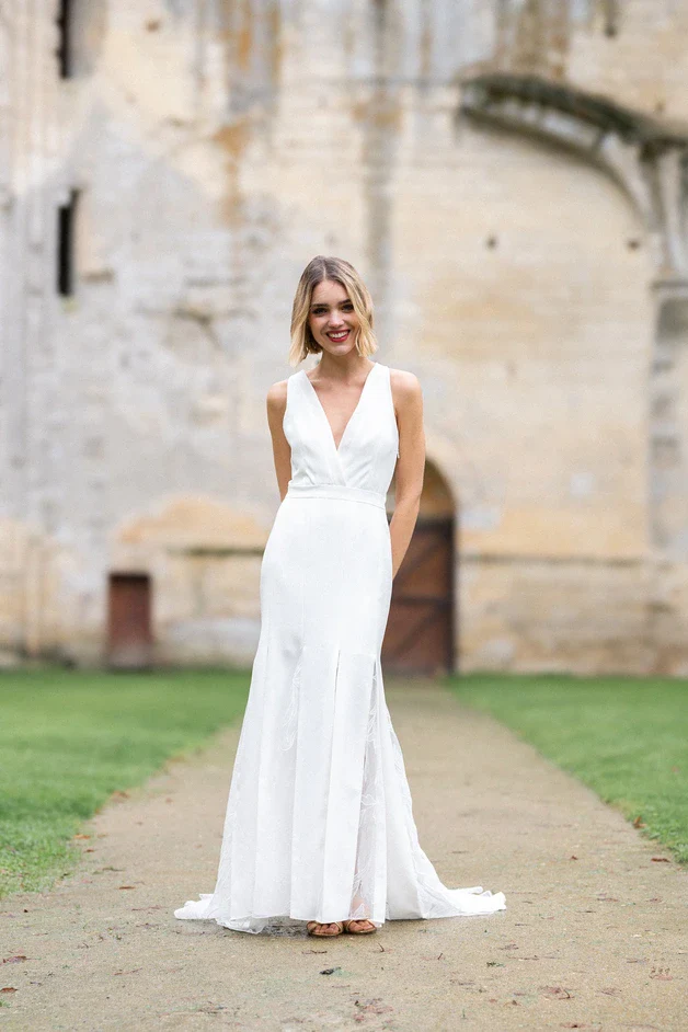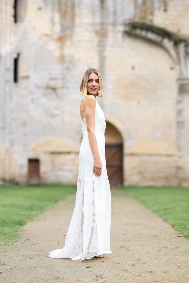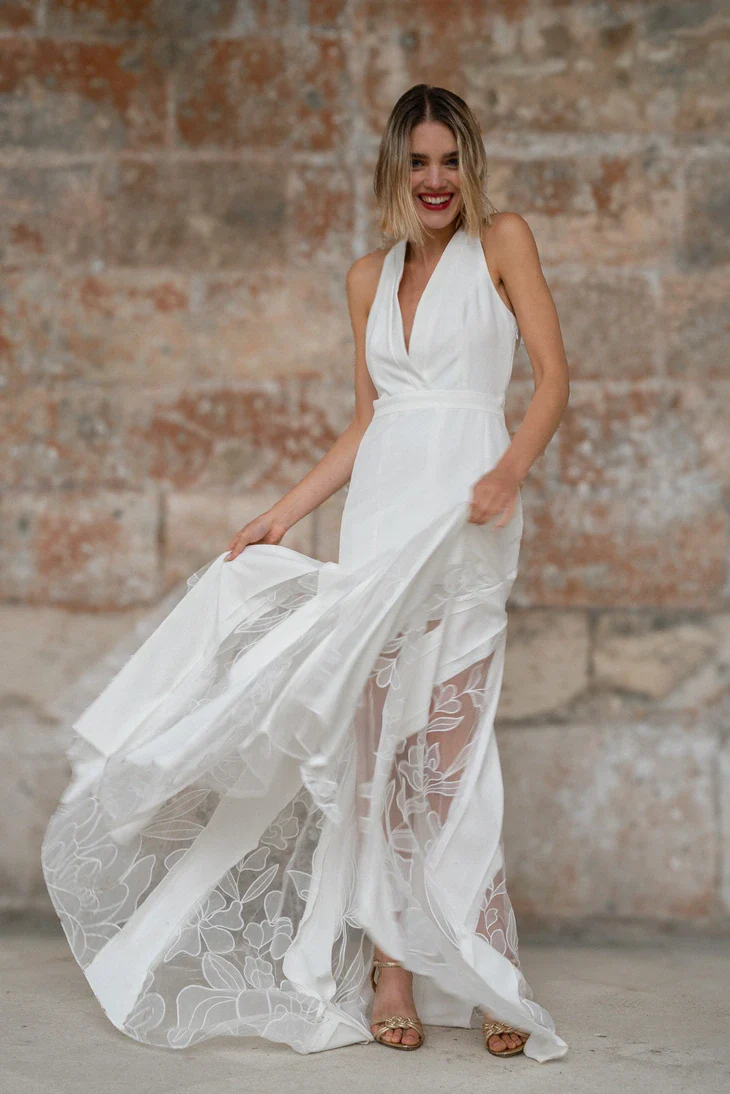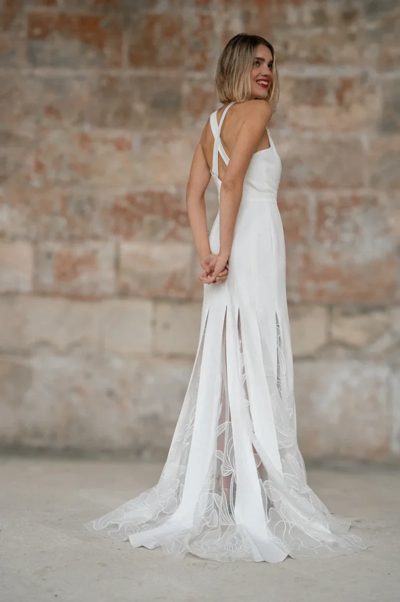 Cette robe de cérémonie est une véritable ode à la délicatesse et à la légèreté. Confectionnée en tulle brodé avec des incrustations en mousseline, elle se distingue par son décolleté plongeant qui sublime le buste. Le dos croisé ajoute une touche sensuelle et moderne, tandis que le bas de la robe, orné d’incrustations en mousseline, dévoile subtilement les jambes grâce à un jeu de transparence délicat. La doublure, disponible en soie ou polyester, garantit confort et fluidité pour accompagner la mariée tout au long de la journée.
