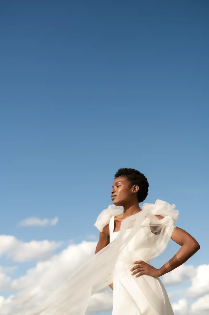 Fixé sur les épaules, il crée un effet de manches aériennes qui encadrent la silhouette avec délicatesse. Les pans de tulle, longs et vaporeux, descendent dans le dos et apportent une dimension théâtrale et élégante à l’ensemble.