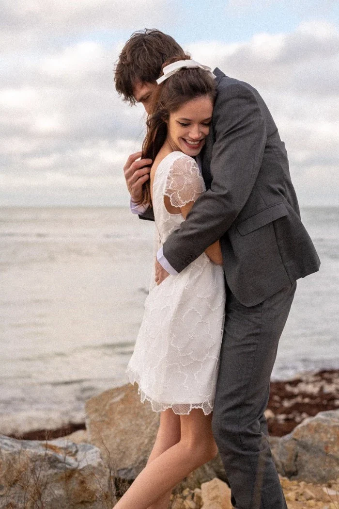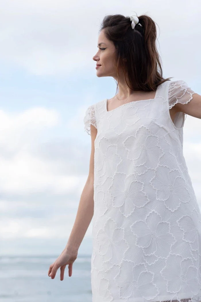 Robe courte baby doll en dentelle fleurie avec ses plis et son décolleté plongeant au dos pour un effet résolument moderne et féminin.