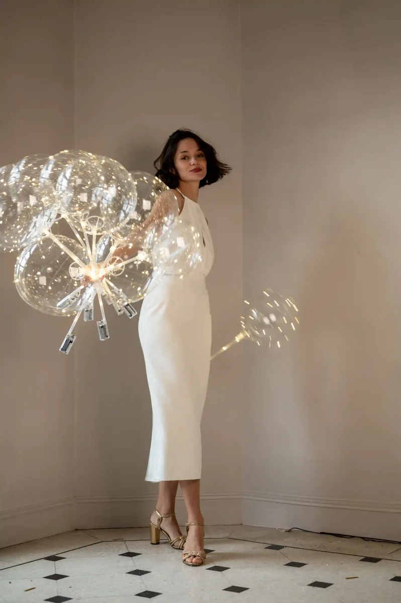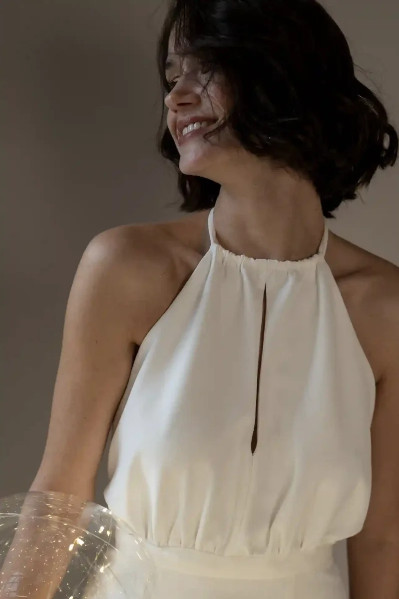 Cette robe mariage civil est parfaite pour une cérémonie élégante en mairie, un dîner chic ou une fête dansante. Conçue pour les mariées qui recherchent une robe de mariée mi-longue sophistiquée mais sans fioritures, elle est le choix idéal pour célébrer avec style et légèreté.