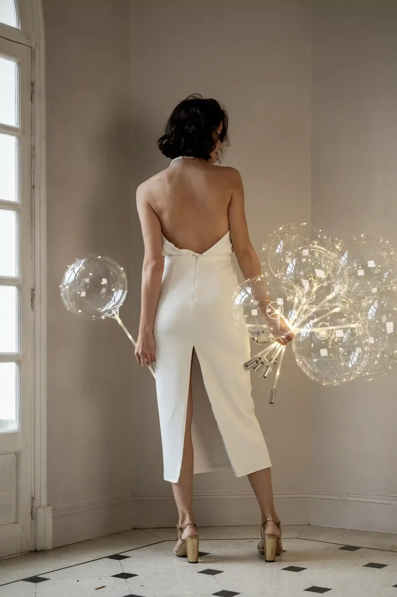 Sublimez votre cérémonie de mariage avec cette robe de mariée civile au design élégant et minimaliste. En polyester fluide, elle combine avec brio sensualité et sophistication. Le haut dispose d’une petite ouverture délicate au niveau du décolleté, tandis que l’arrière révèle un grand dos nu maintenu par une attache au niveau de la nuque. La jupe mi-longue fendue à l’arrière apporte une touche audacieuse à cette robe de mariée simple.