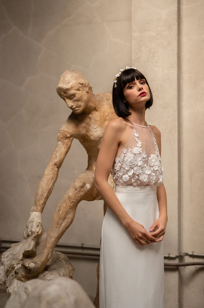 Robe longue un brin provocante avec son top en tulle brodé à la main de fleurs en dentelle pour cacher délicatement votre poitrine tout en laissant un dos parfaitement transparent souligné par une rangée de boutons. Sa jupe légèrement fourreau agrémentée d’une quille au dos se terminant en traine allongera votre silhouette a l’infini.