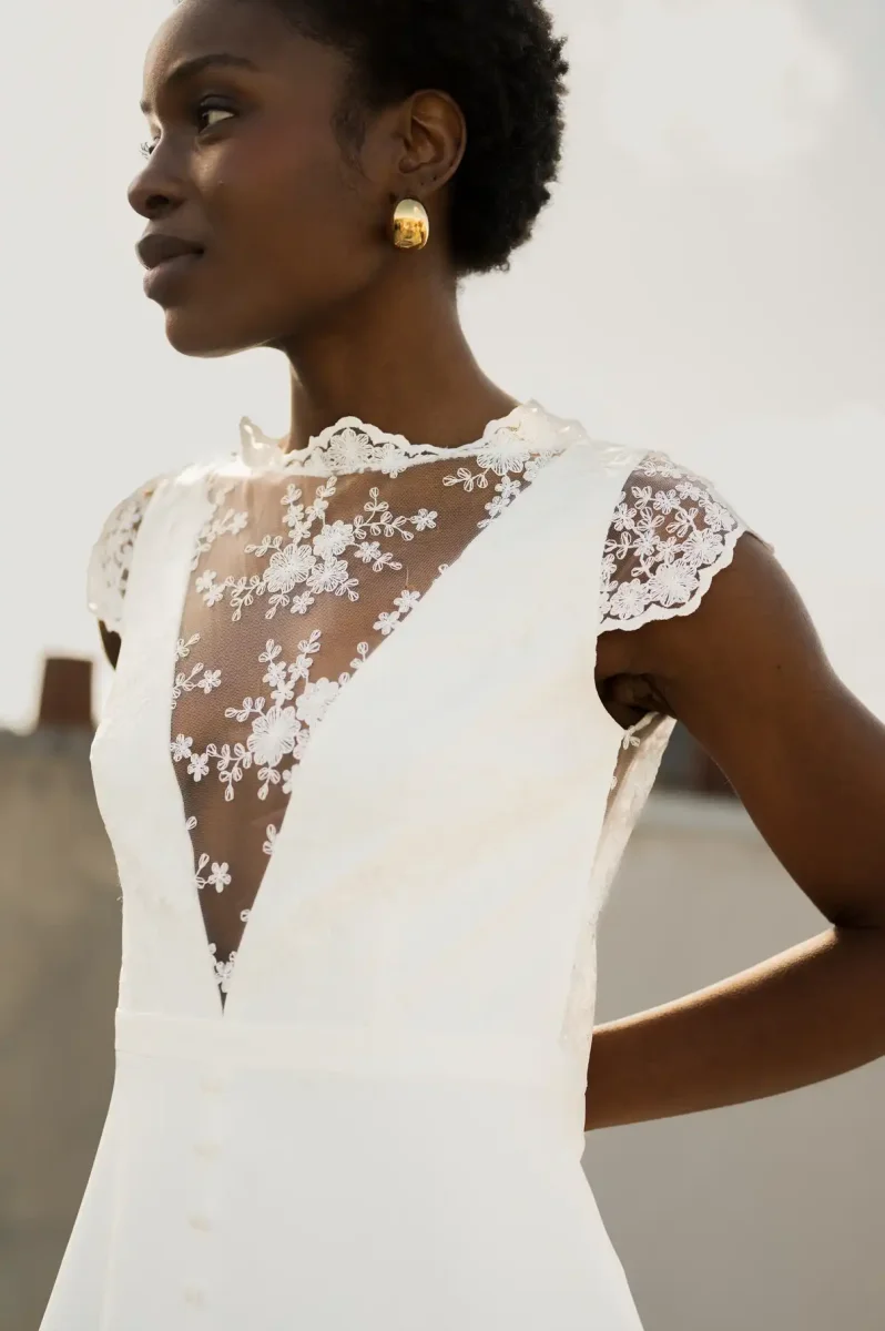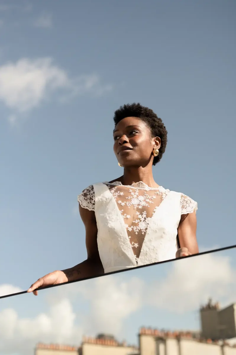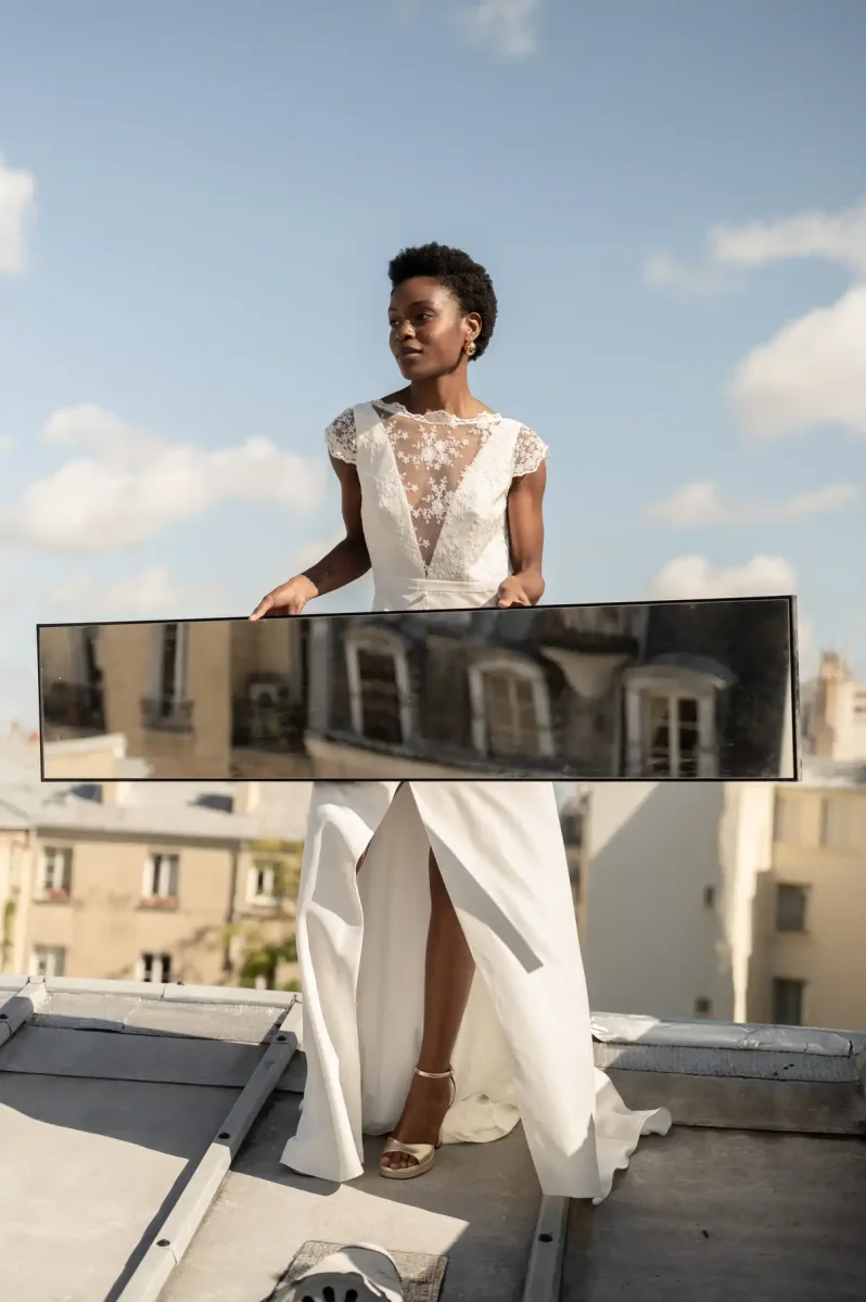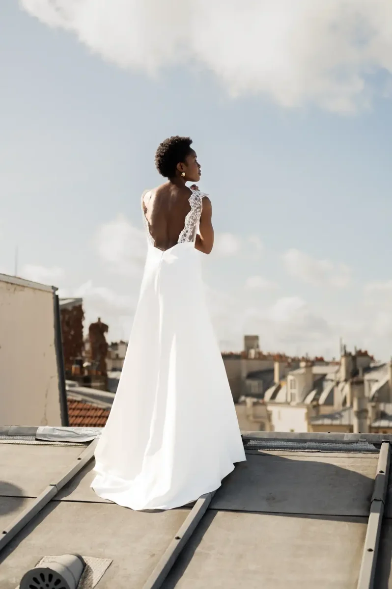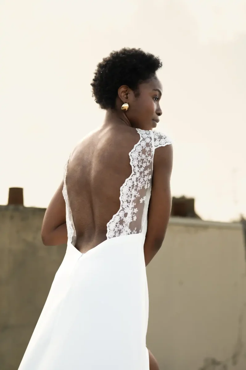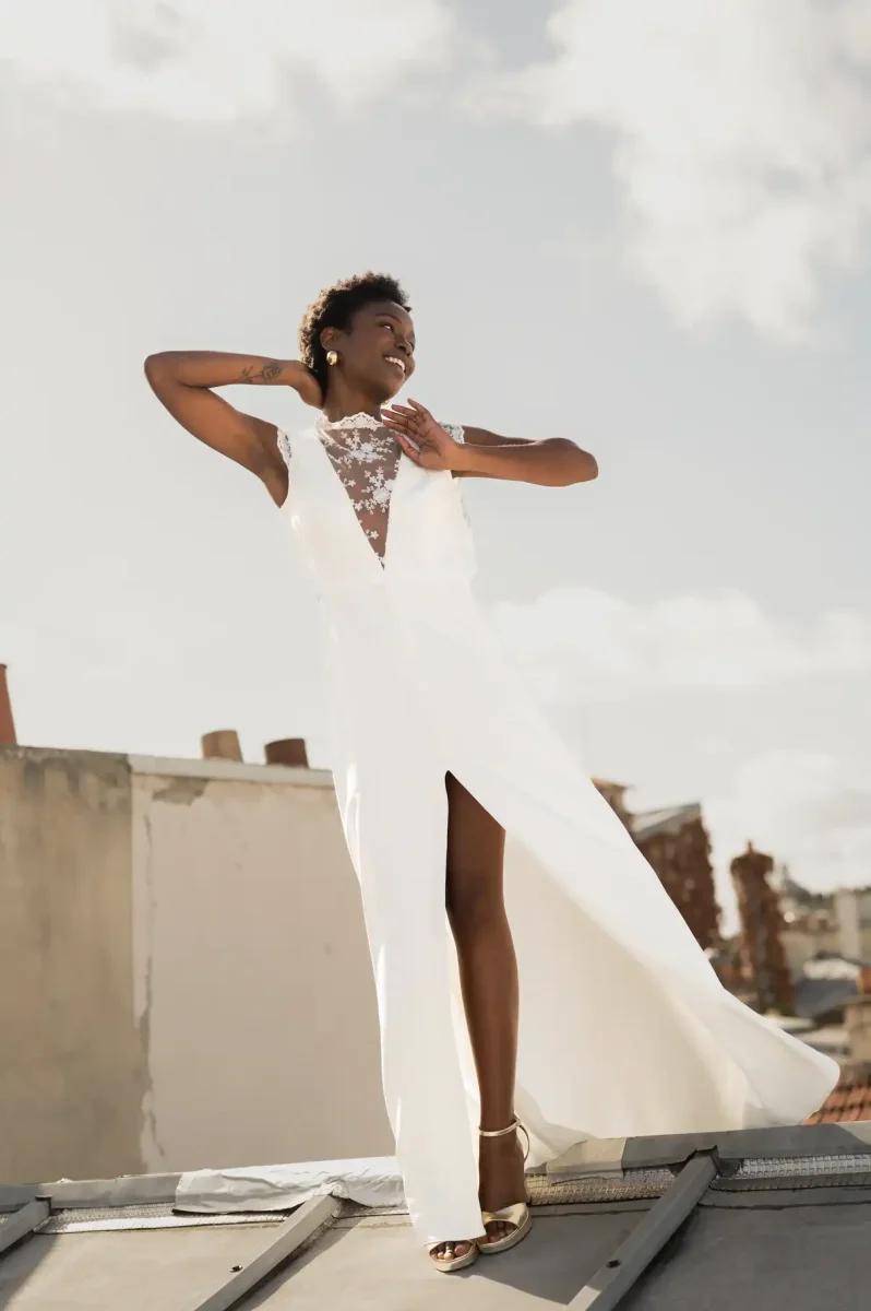 Lumineuse et audacieuse, cette robe de mariée incarne une élégance contemporaine pleine de grâce.