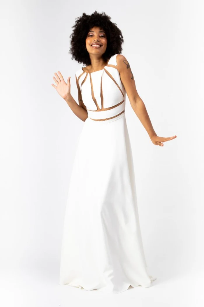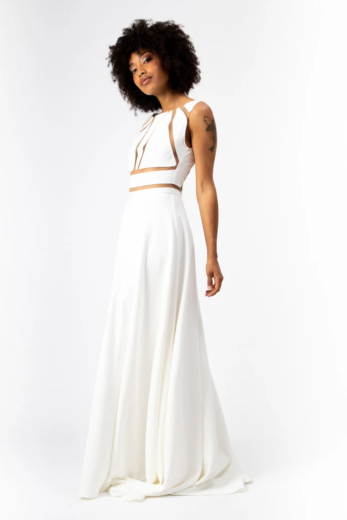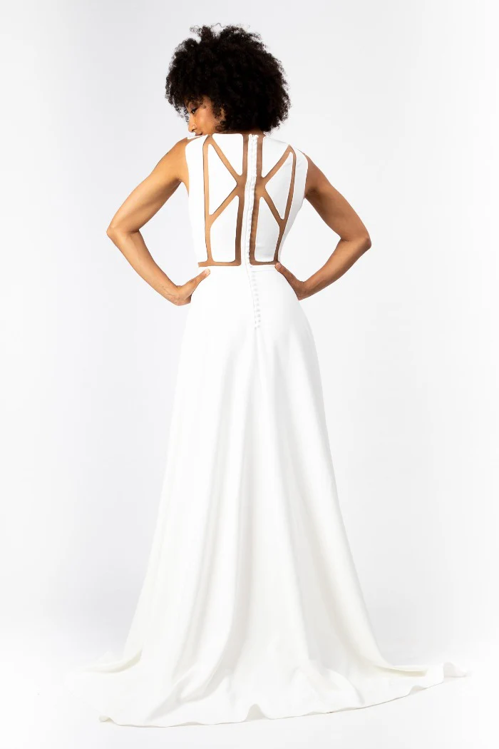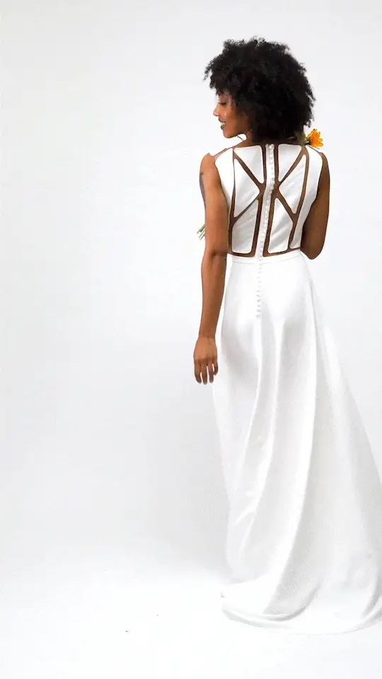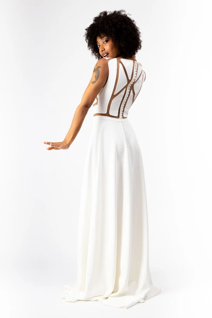 Robe originale et décalée composée de son haut aux découpes ajourées esprit art déco et sa jupe longue joliment évasée, avec traine, fermée par une fermeture invisible agrémentée d’une longue rangée de boutons au dos.