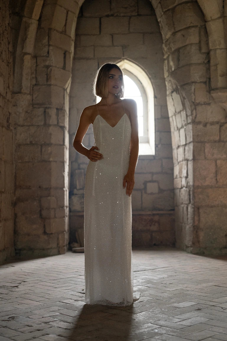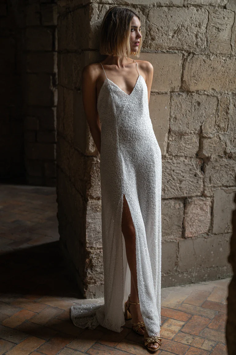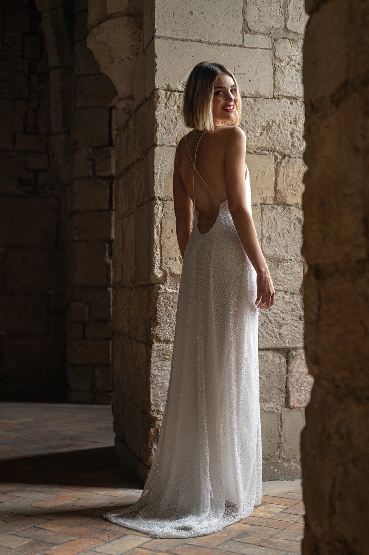 Sublimez votre silhouette avec cette robe de mariée en tulle perlé allover, signée L’Amusée. Sa coupe longue et élégante, associée à un décolleté plongeant dans le dos, offre une allure sensuelle et raffinée, parfaite pour une mariée sexy. Le tissu en tulle entièrement perlé capture la lumière pour un effet étincelant et glamour, tandis que la fente subtile sur la jupe dévoile délicatement la jambe, apportant un équilibre entre sophistication et sensualité.