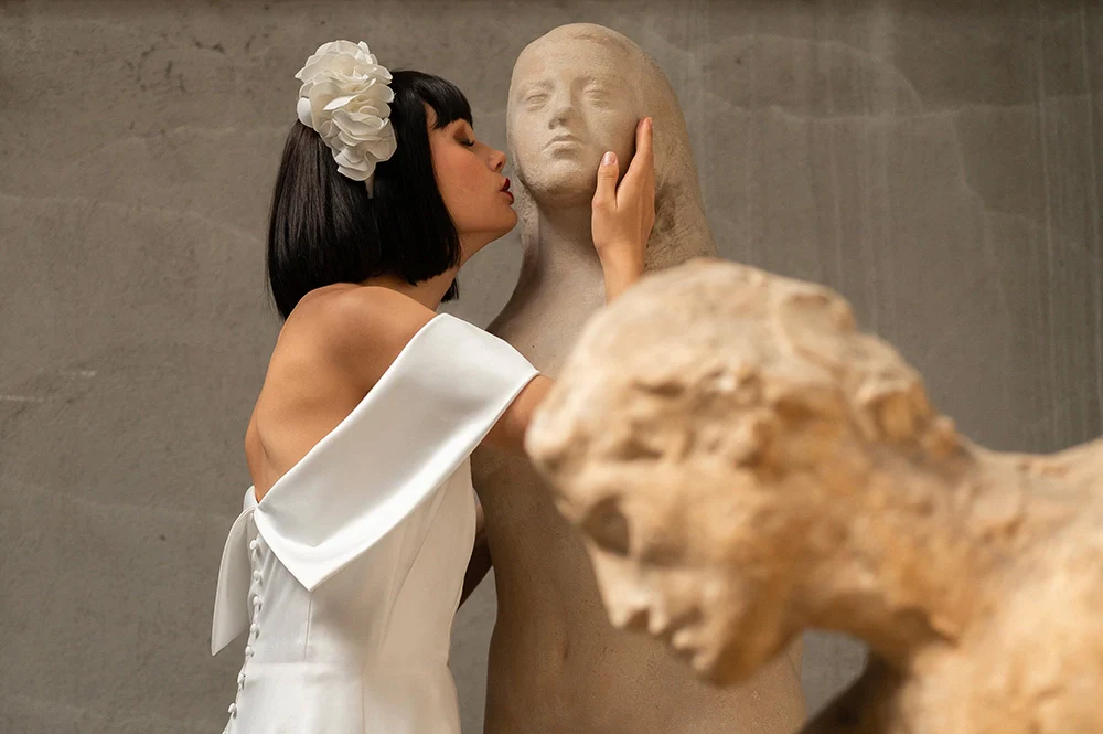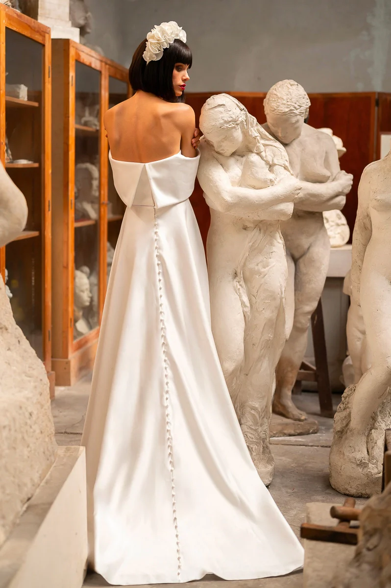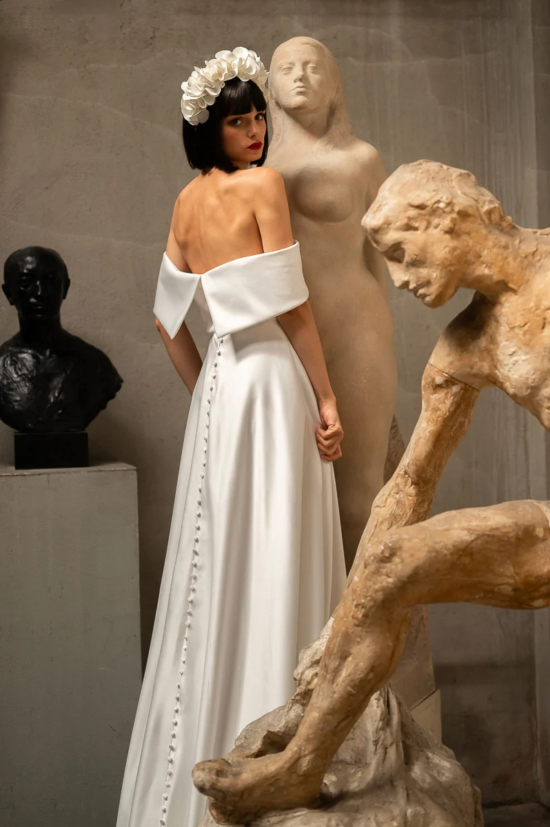 Robe architecturale en satin duchesse très légèrement brillant qui saura vous mettre en valeur. Son col bardot mettra en avant votre port de tête, vos épaules et votre dos d’une façon très sensuelle. Sa maxi jupe est soulignée par des boutons couvrant tout le long du dos jusqu’au bout de sa longue traine.