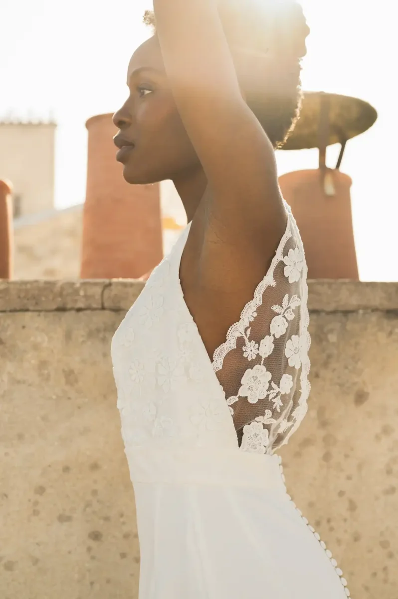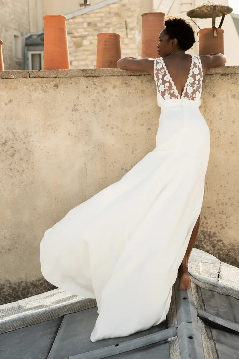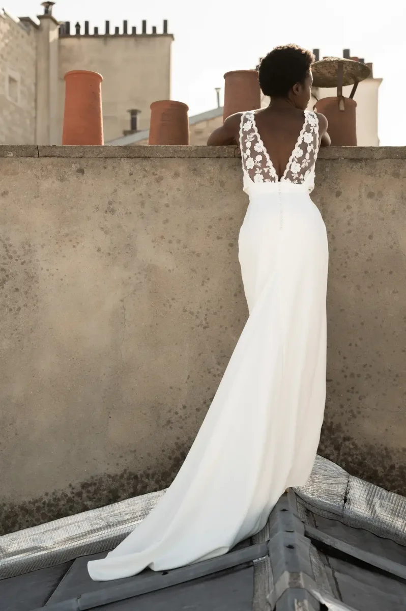 Une légère traîne vient parfaire l’allure, pour un rendu à la fois romantique et affirmé.