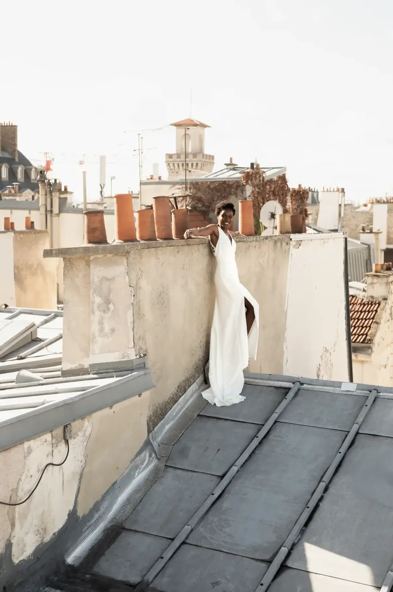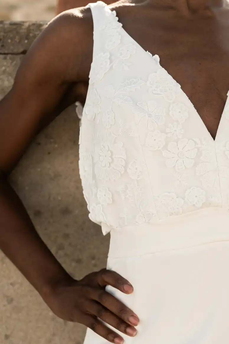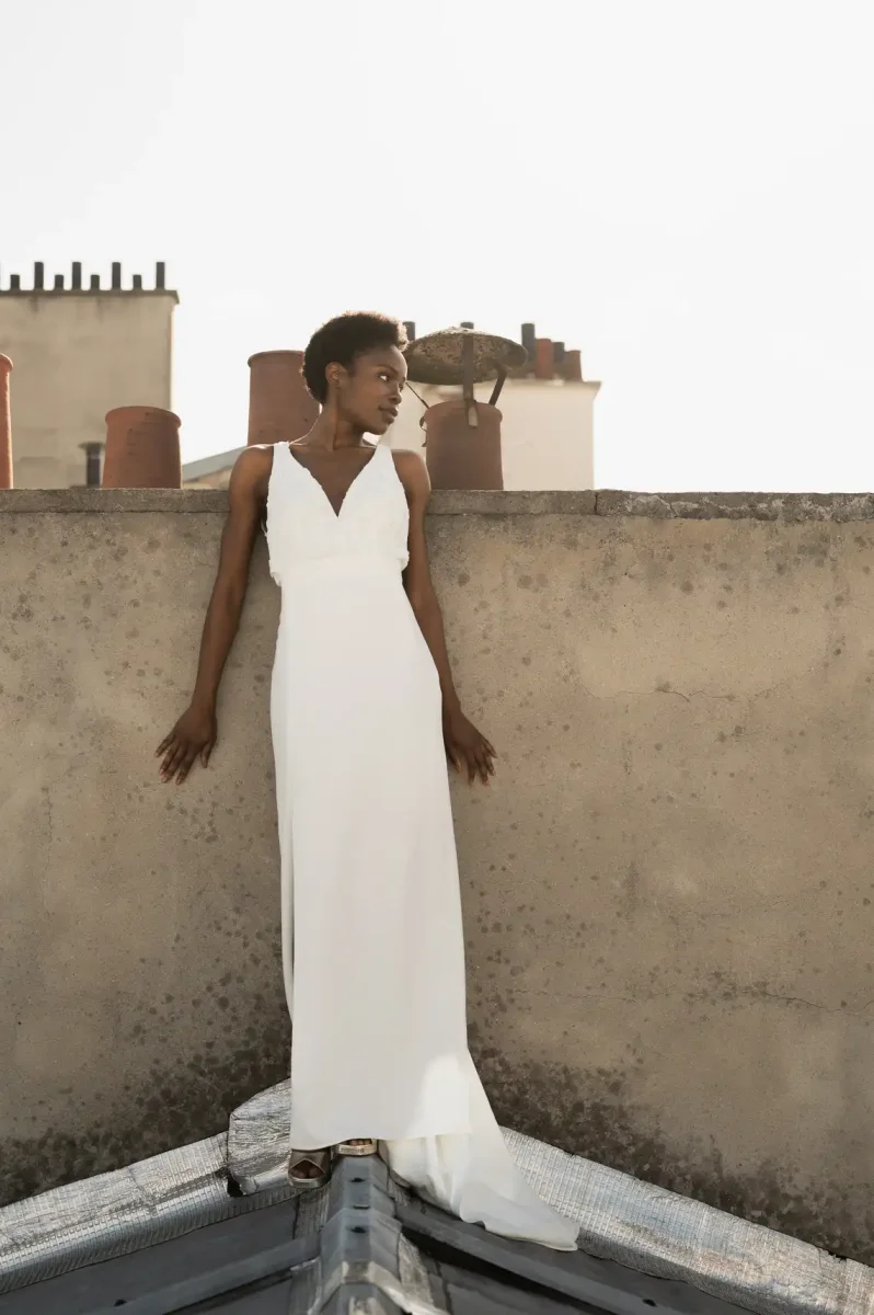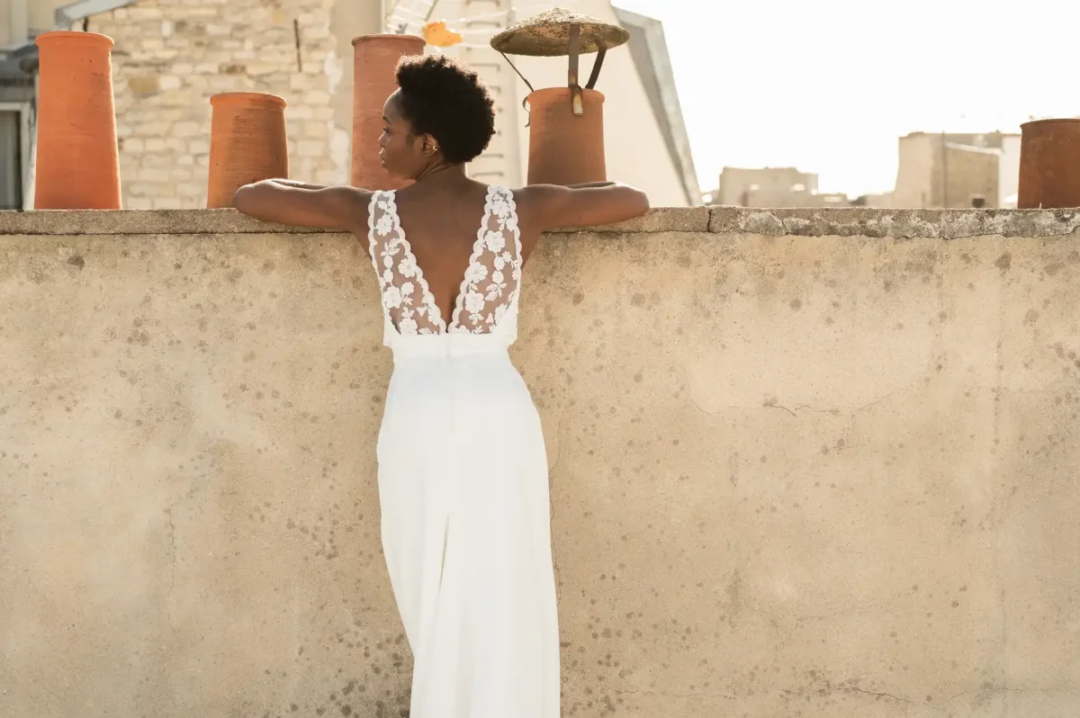 Une légère traîne vient parfaire l’allure, pour un rendu à la fois romantique et affirmé.