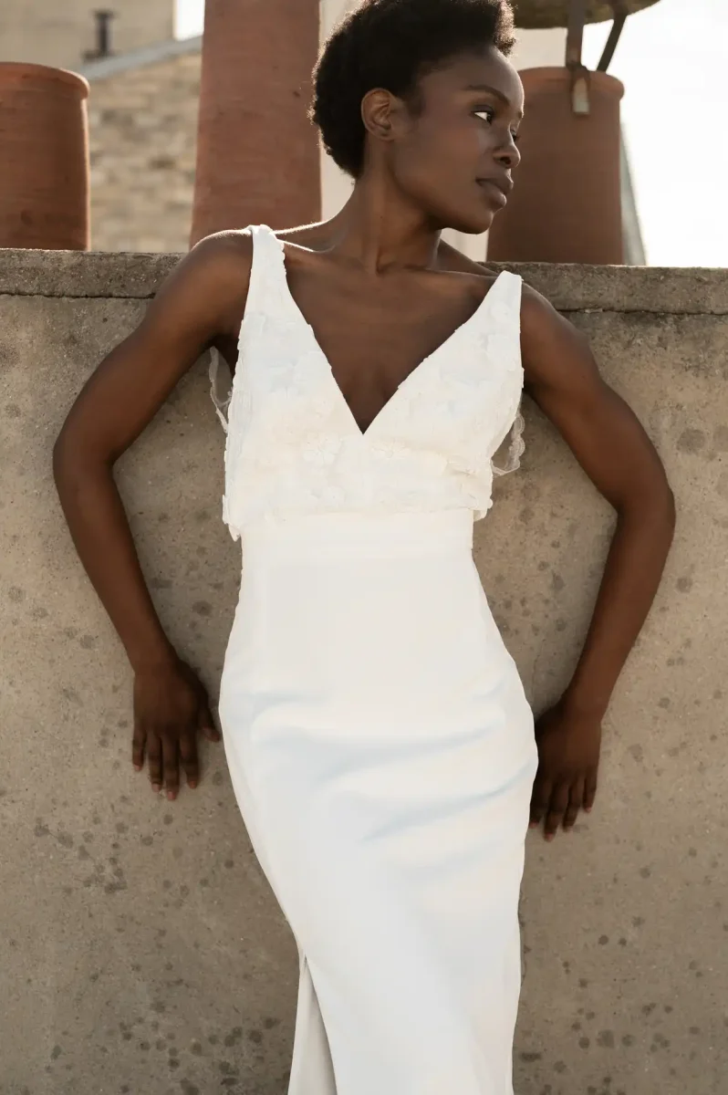 Découvrez cette robe de mariée à la fois moderne et sensuelle, pensée pour sublimer la silhouette avec élégance.