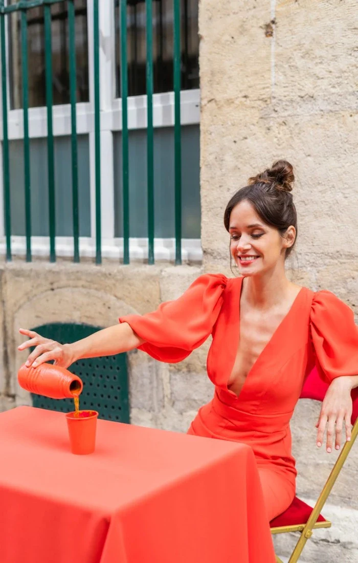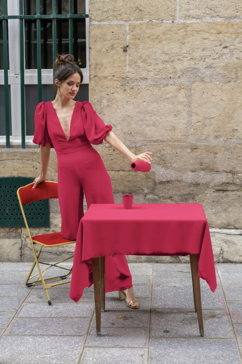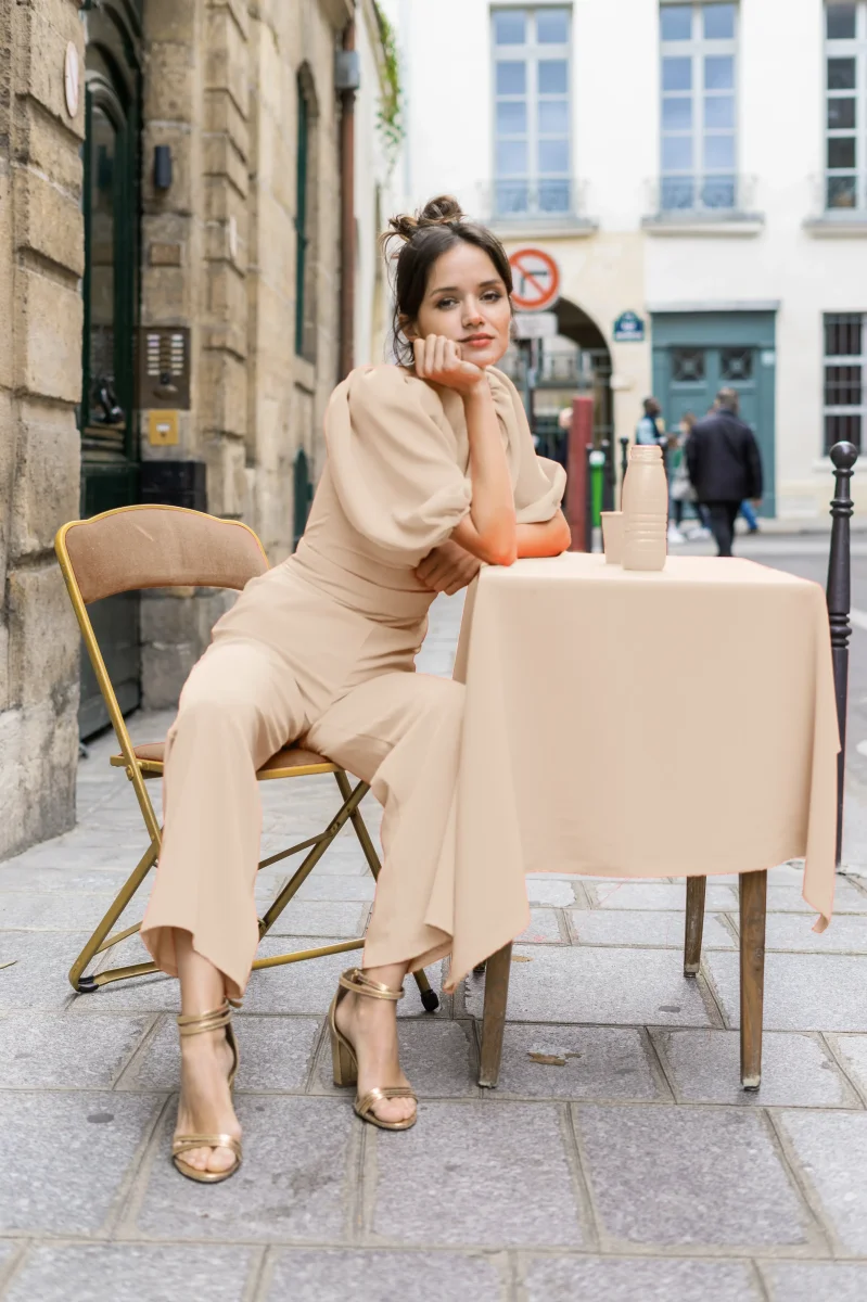 Combinaison pantalon taille haute avec son top à décolleté plongeant et dos nu. Pour un côté plus chic, vous pouvez rajouter les manches ballons.