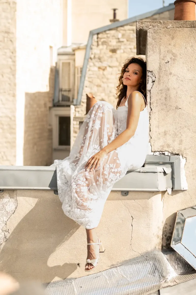 Sa coupe fluide, habillée d’une sur-robe en dentelle fleurie,
