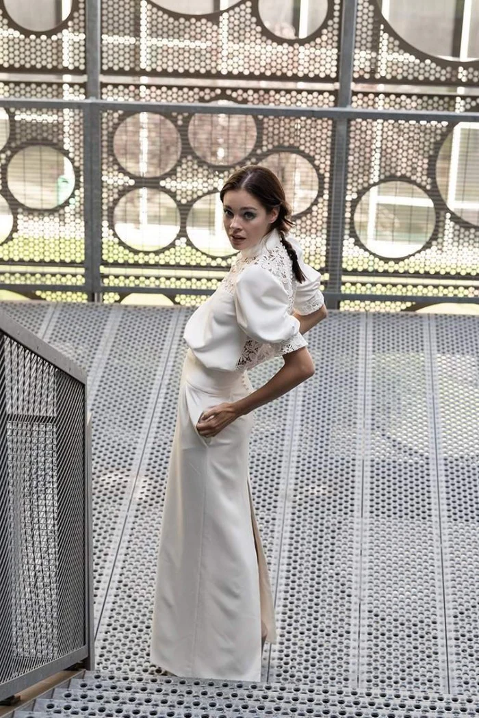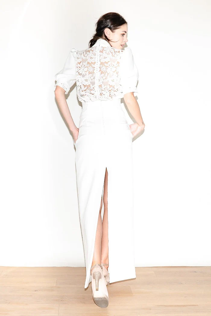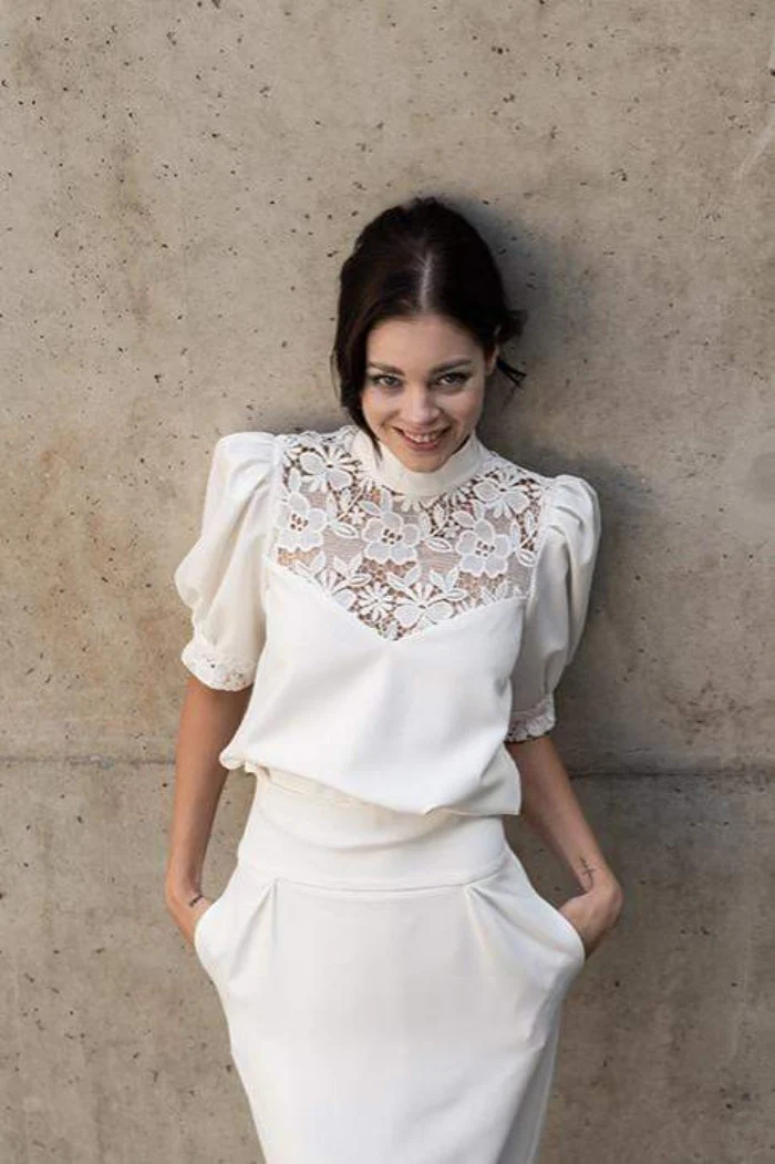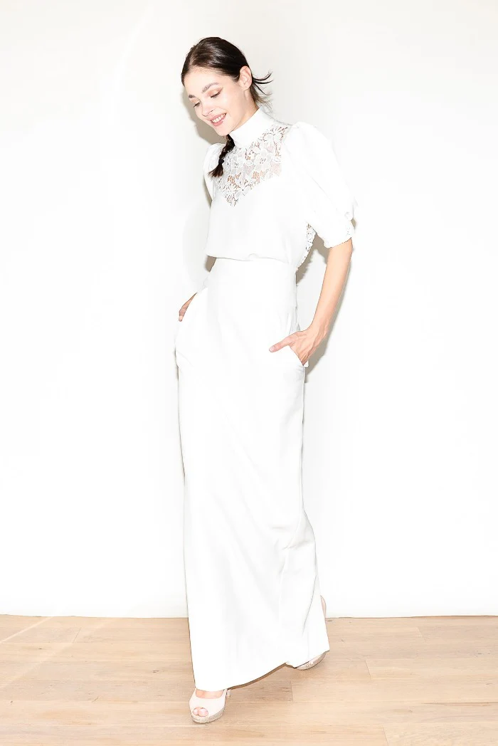 Ensemble jupe droite à poche, fendue au dos et son top col montant, incrustation de guipure entièrement boutonné au dos.
