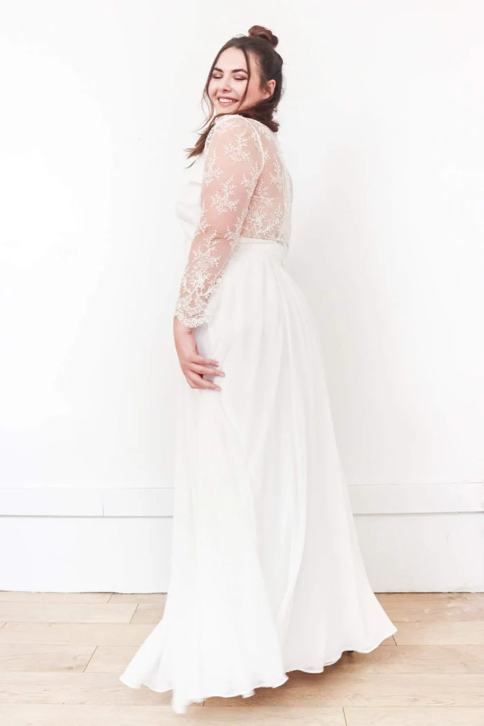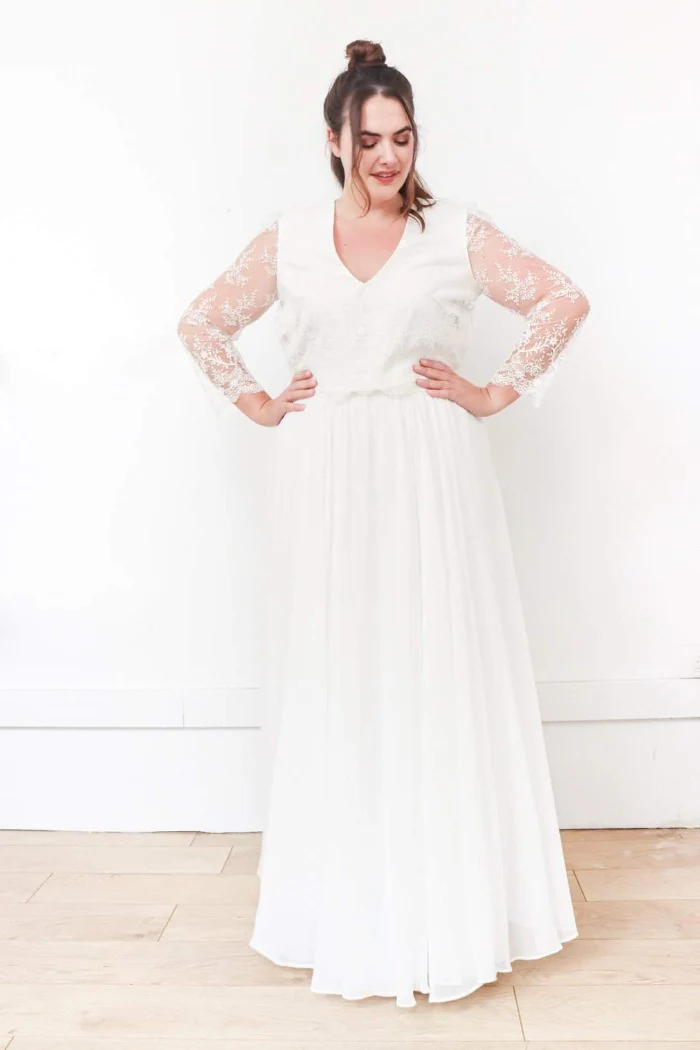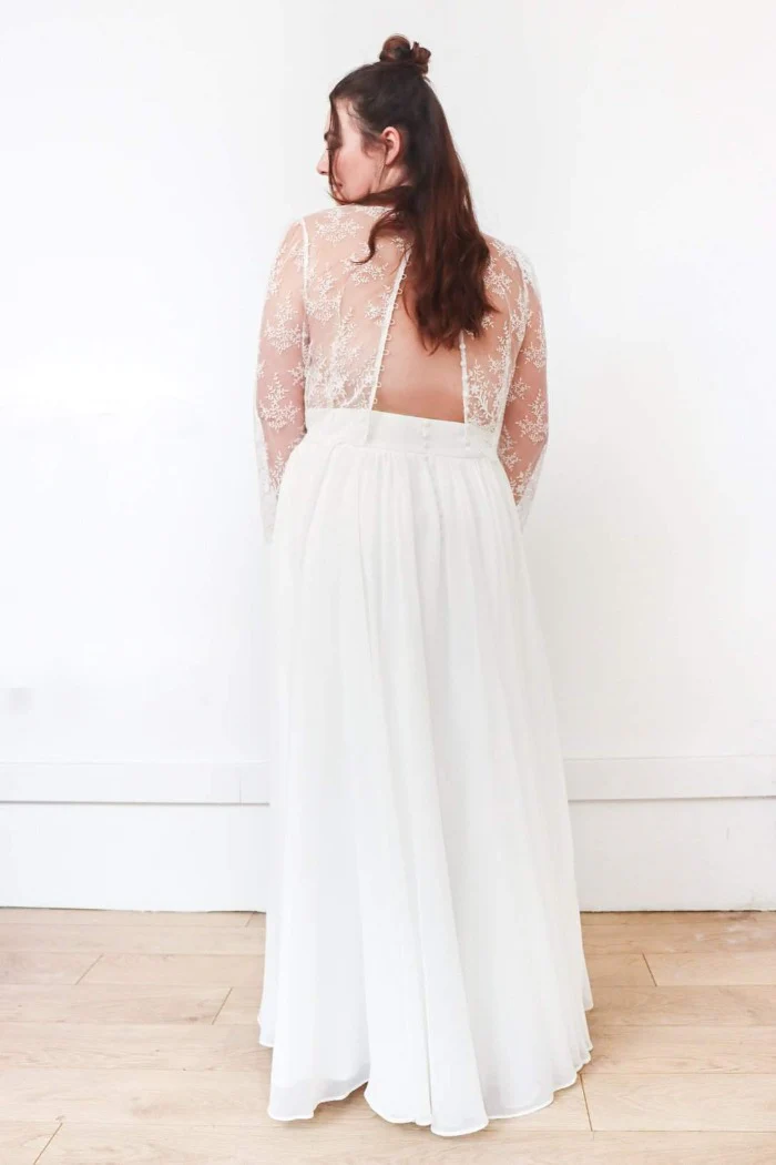 Ensemble composé d’un top dentelle dos transparent boutonné, manches 3/4 et d’une jupe cercle en mousseline. Fermeture zip invisible côté.