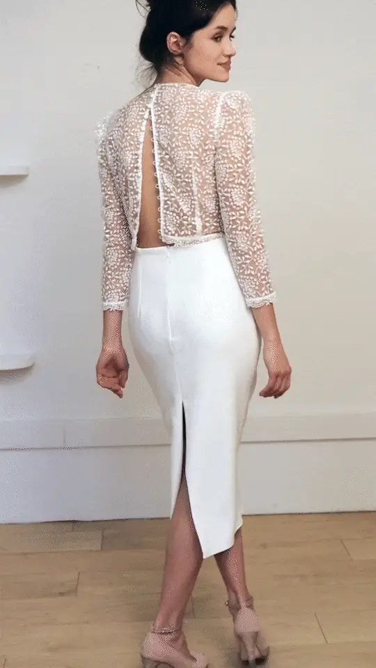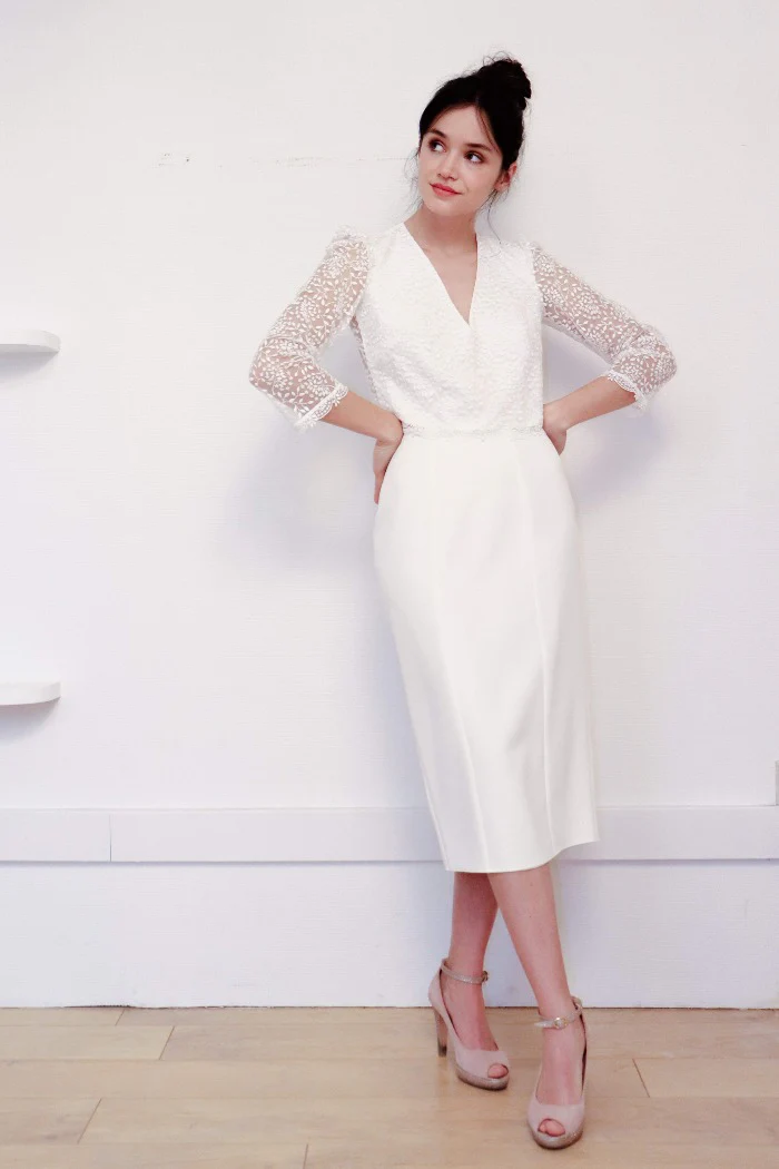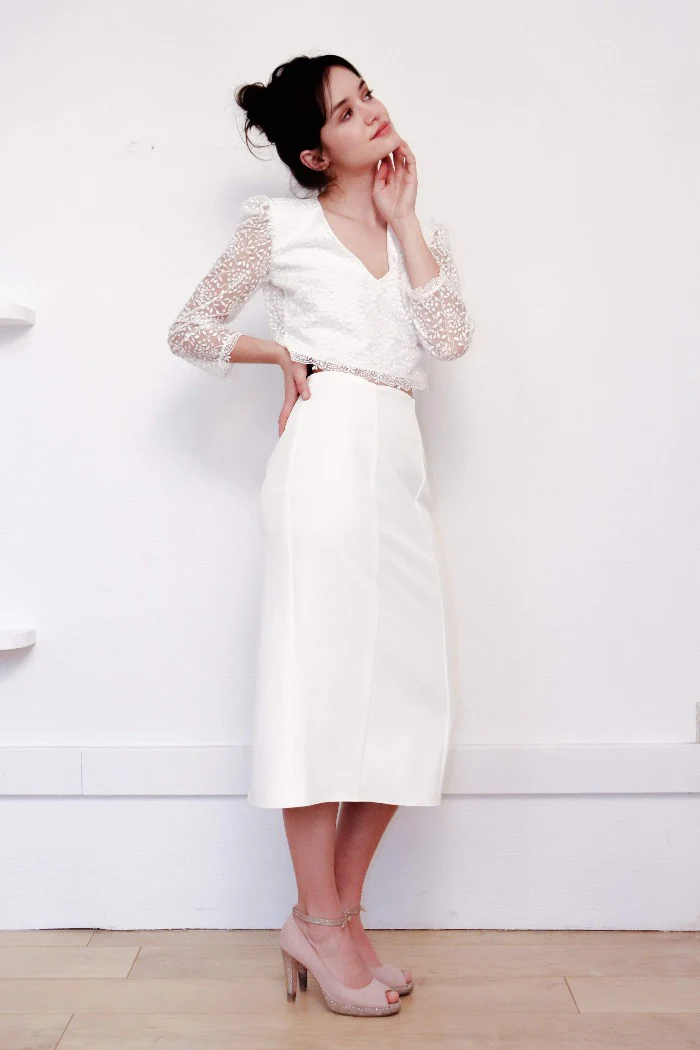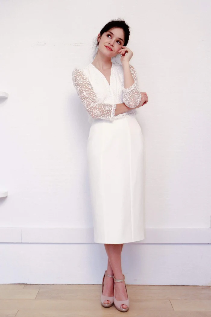 Ensemble jupe crayon midi et top dentelle, col V, manches 3/4 et dos boutonné.