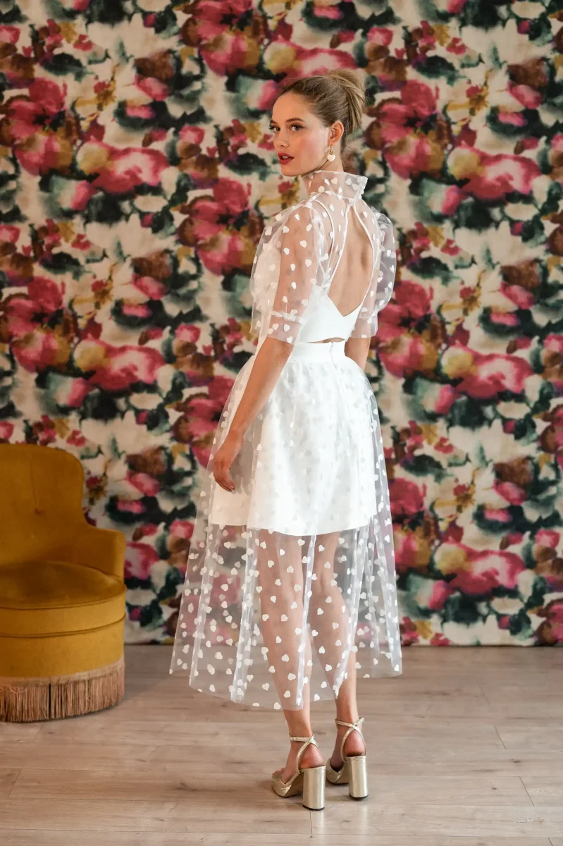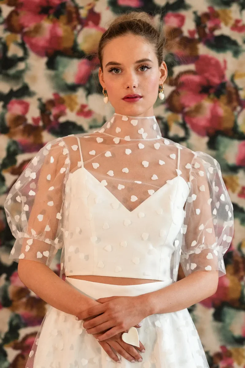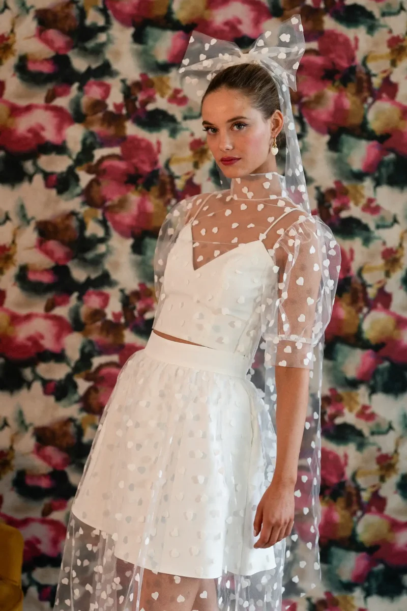 Ce qui fait toute la différence : Superposition top et débardeur structuré Motifs cœurs en relief, signature forte Dos ouvert élégant et graphique Pour quelle occasion ? Parfaite pour un mariage civil ou pour des moments de célébration, cette tenue s’adresse aux mariées qui aiment les pièces fortes tout en finesse 🤍