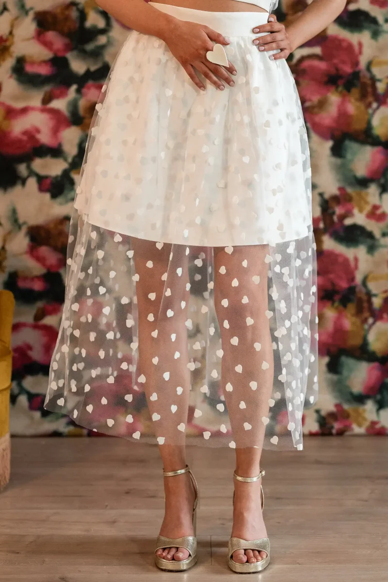 Audacieuse sans en faire trop, cette tenue séduit par son jeu de superpositions et de transparence. Le débardeur structuré est recouvert d’un top léger aux motifs cœurs, apportant une touche graphique et contemporaine. La jupe, fluide et aérienne, crée un joli contraste entre opacité et transparence pour une silhouette moderne et pleine de mouvement.💕