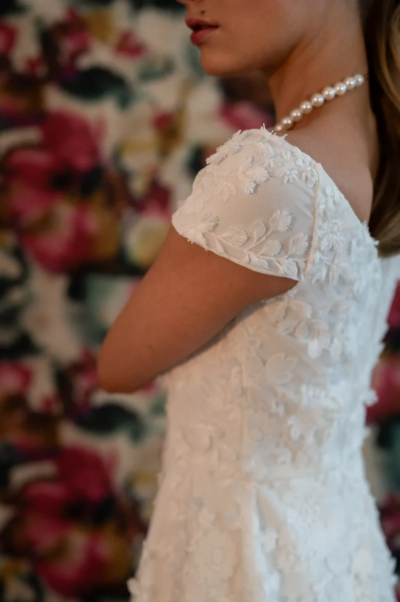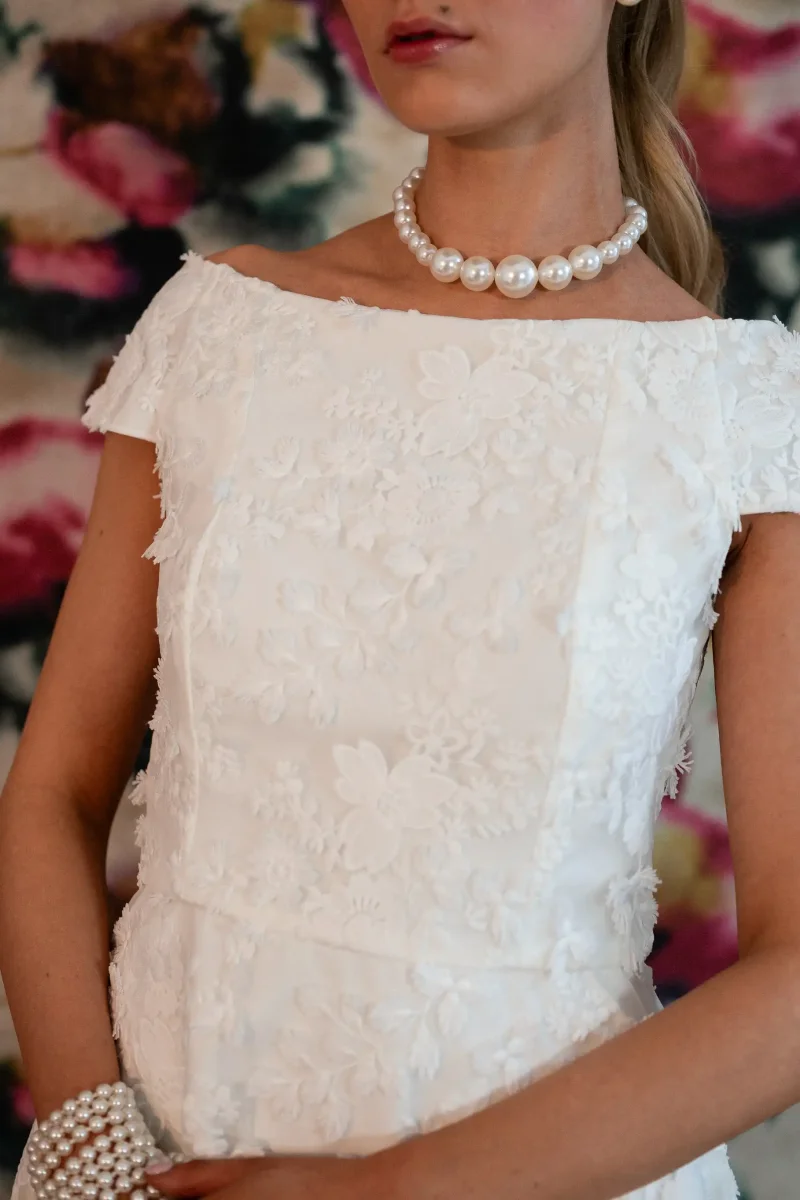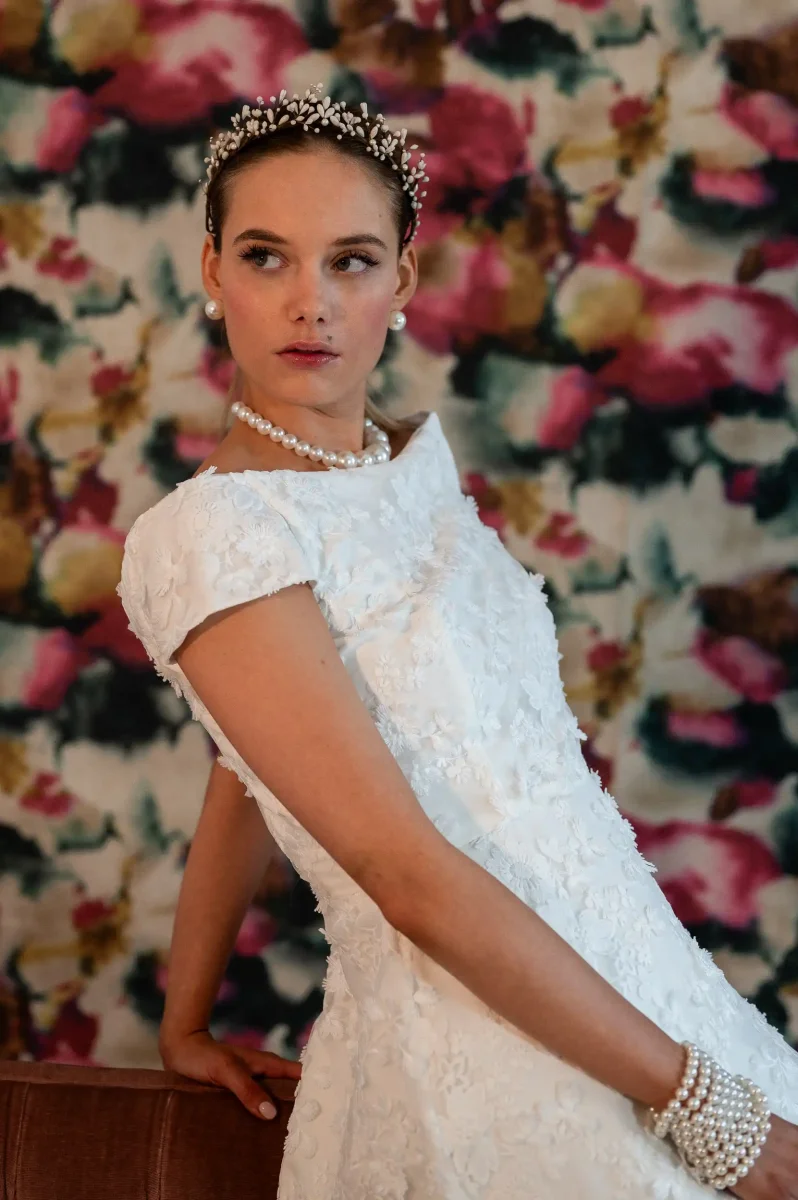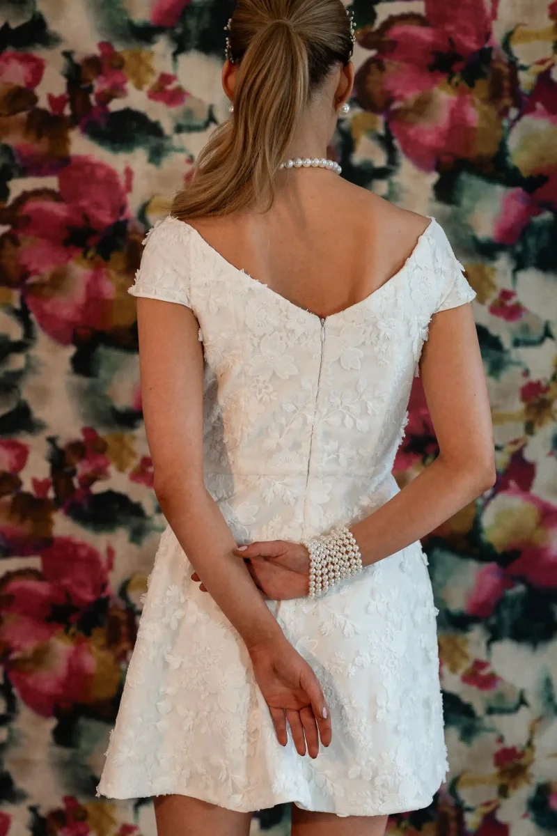 Ce qui fait toute la différence : Coupe courte structurée Motifs floraux en relief, tout en finesse Encolure délicate pour une silhouette équilibrée Allure élégante, facile à porter Pour quelle occasion ? Parfaite pour un mariage civil, une réception élégante ou un brunch du lendemain, cette robe s’adresse aux mariées en quête d’une tenue chic, contemporaine et facile à vivre✨