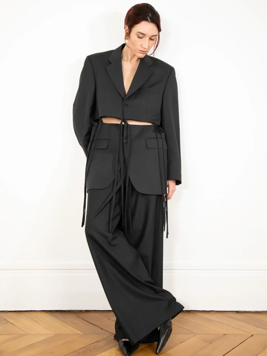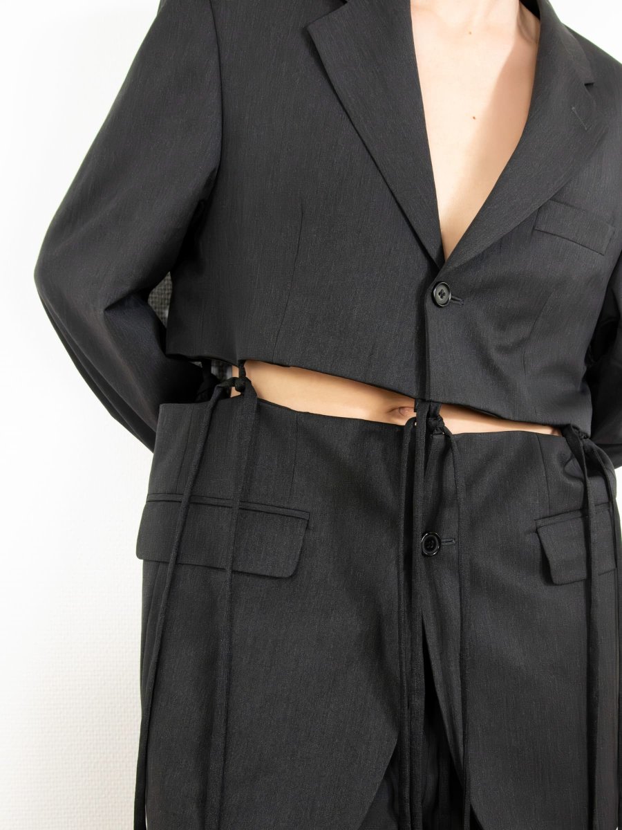 Blazer modulable en deux parties reliées par des liens en tissus.