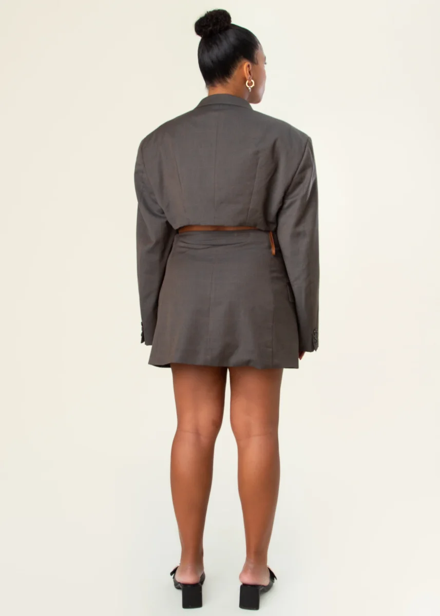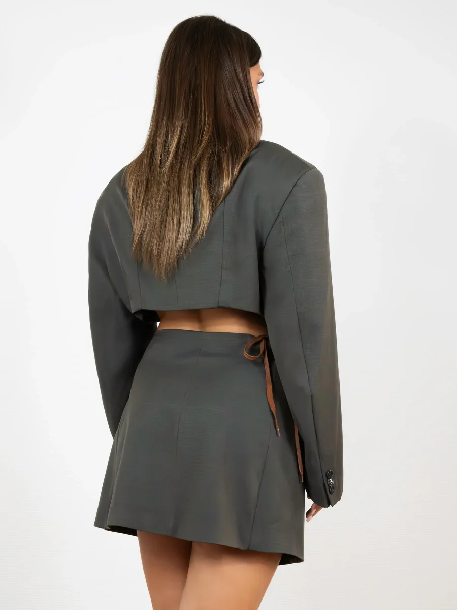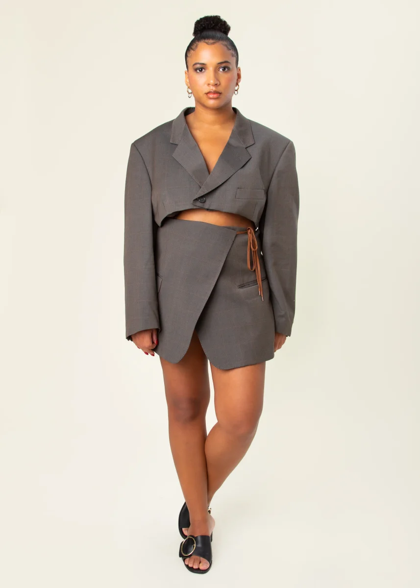 Ensemble tailleur avec blazer court et jupe portefeuille ajustable à lacet. Coloris marron à carreaux.