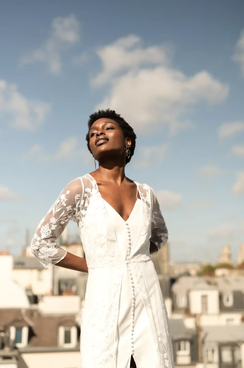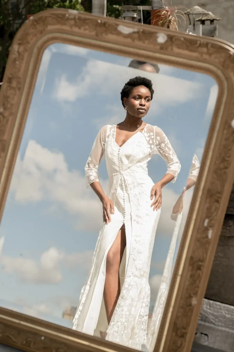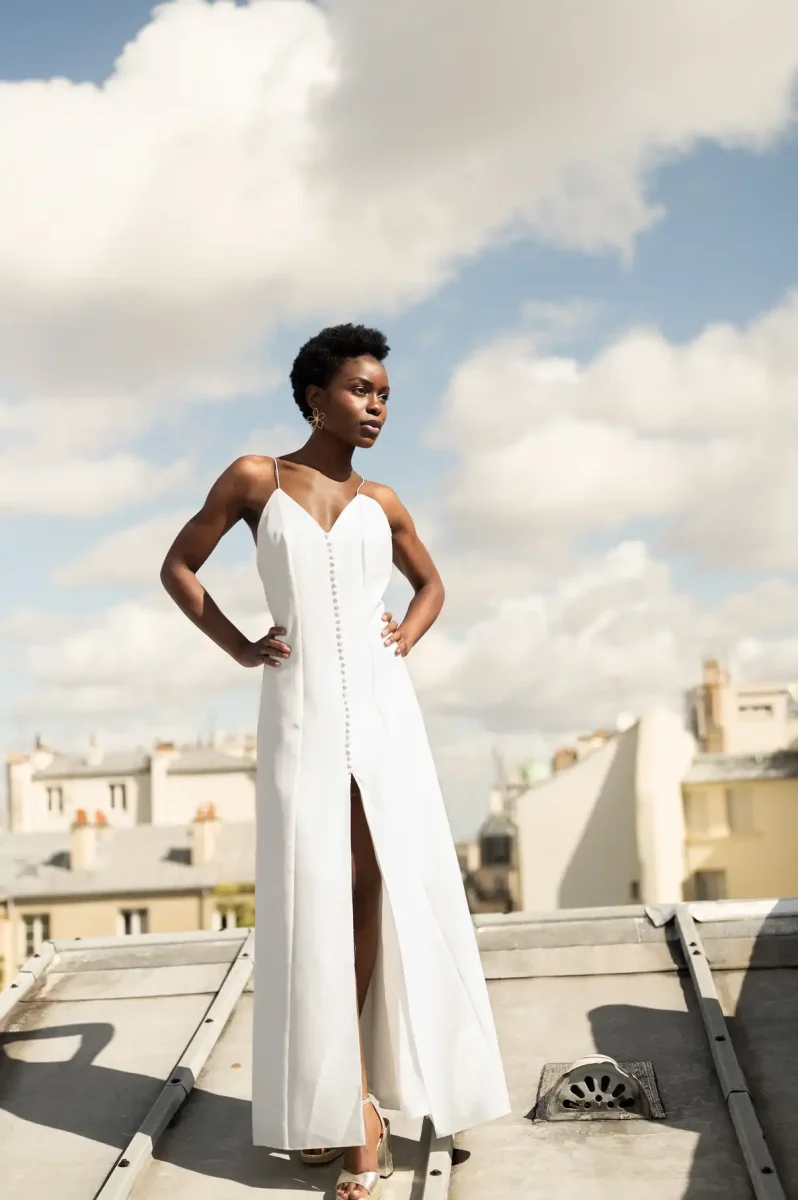 Épurée et audacieuse, cette robe de mariée séduit par sa modernité et son élégance sans artifice.