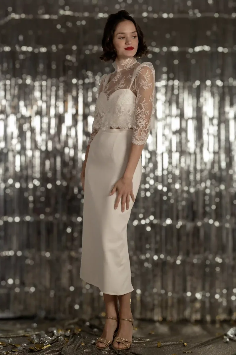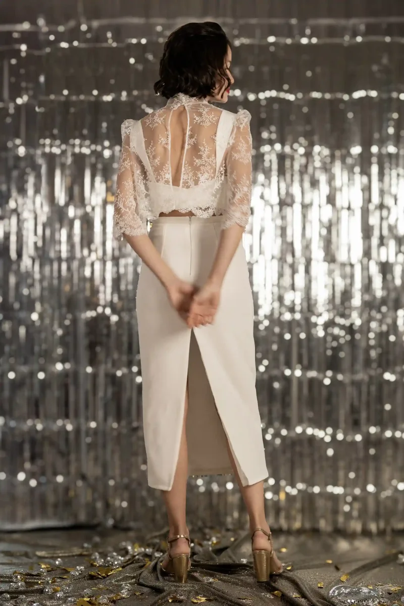 Cet ensemble est parfait pour les mariées civiles qui souhaitent une tenue légère et raffinée, tout en conservant une allure unique. Idéal pour une cérémonie intime ou une réception festive, il reflète une élégance bohème sans effort.