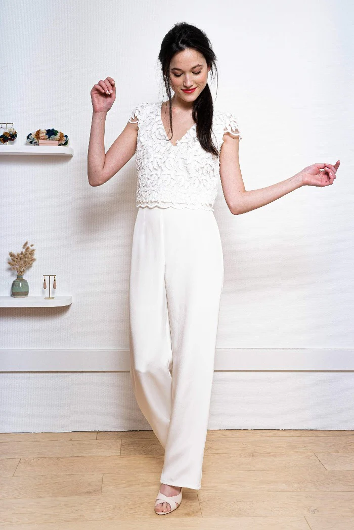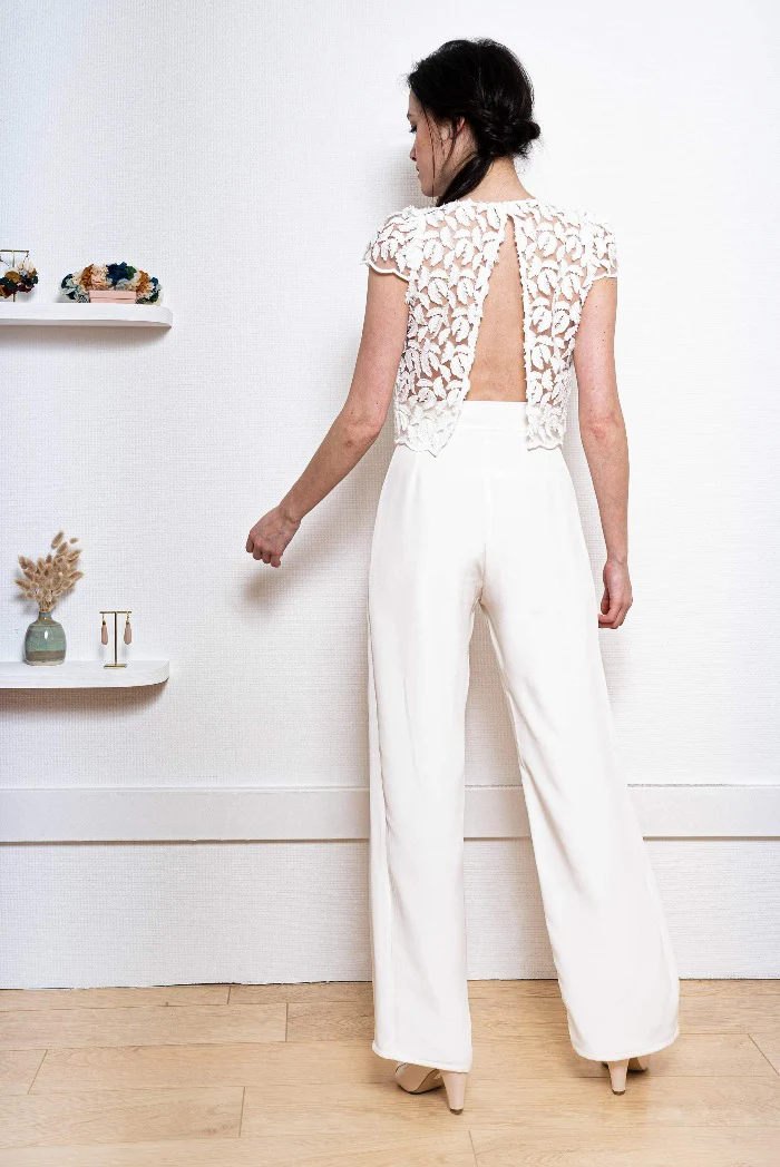 Pantalon droit légèrement évasé avec son haut crop top en plume (ou en crêpe) et son décolleté dos inversé.