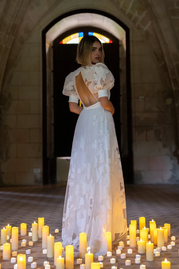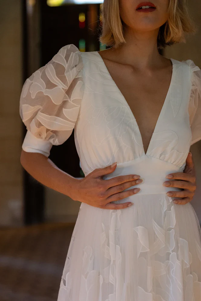 Découvrez cette robe de mariage au charme intemporel. Confectionnée en tulle brodé avec de délicates incrustations d’organza, cette robe se distingue par son design raffiné et son allure vaporeuse. La fluidité du tulle ajoute une légèreté à chaque mouvement, tandis que les manches bouffantes et le dos ouvert créent un contraste subtil entre modernité et romantisme.