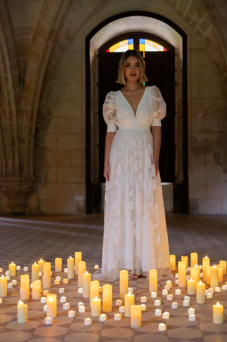 Avec son décolleté en V et sa coupe aérienne, cette robe est parfaite pour une mariée à la recherche d’un look bohème, moderne et sophistiqué.