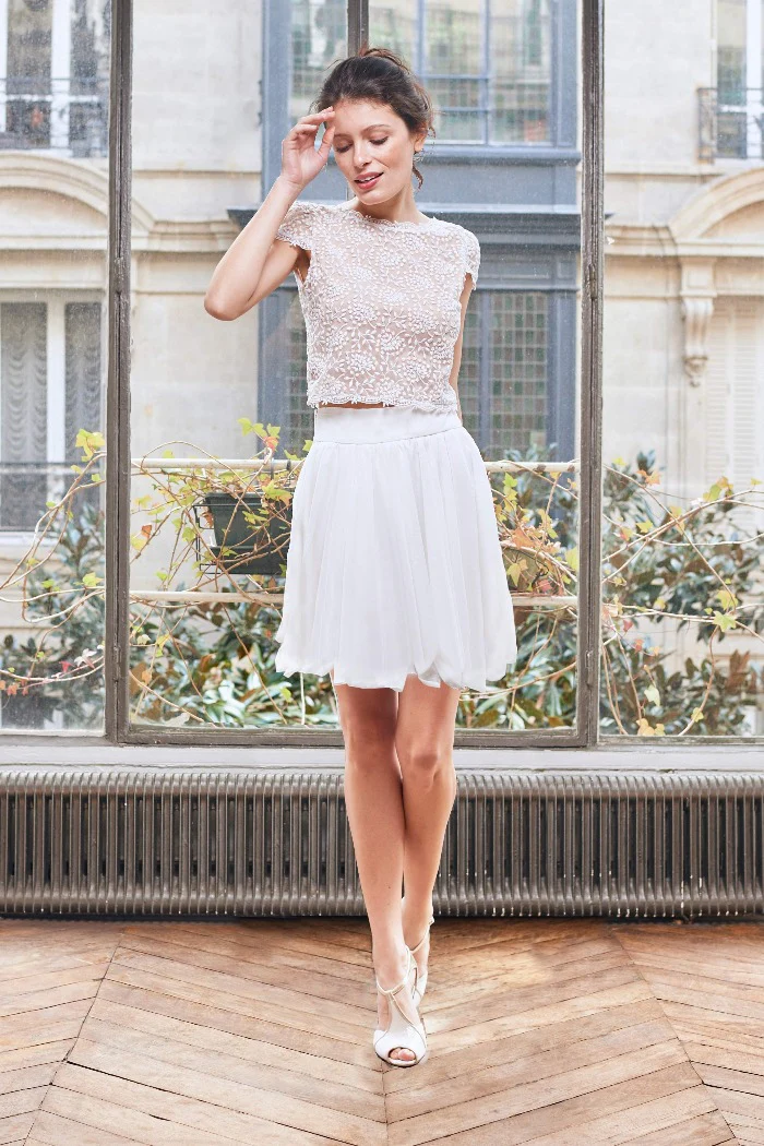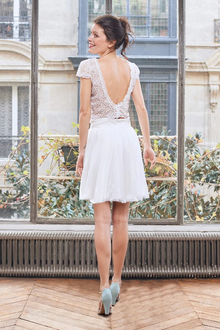 Ensemble composé d’un top dentelle décolleté dos boutonné et d’une jupe cercle en mousseline. Fermeture zip invisible dos.