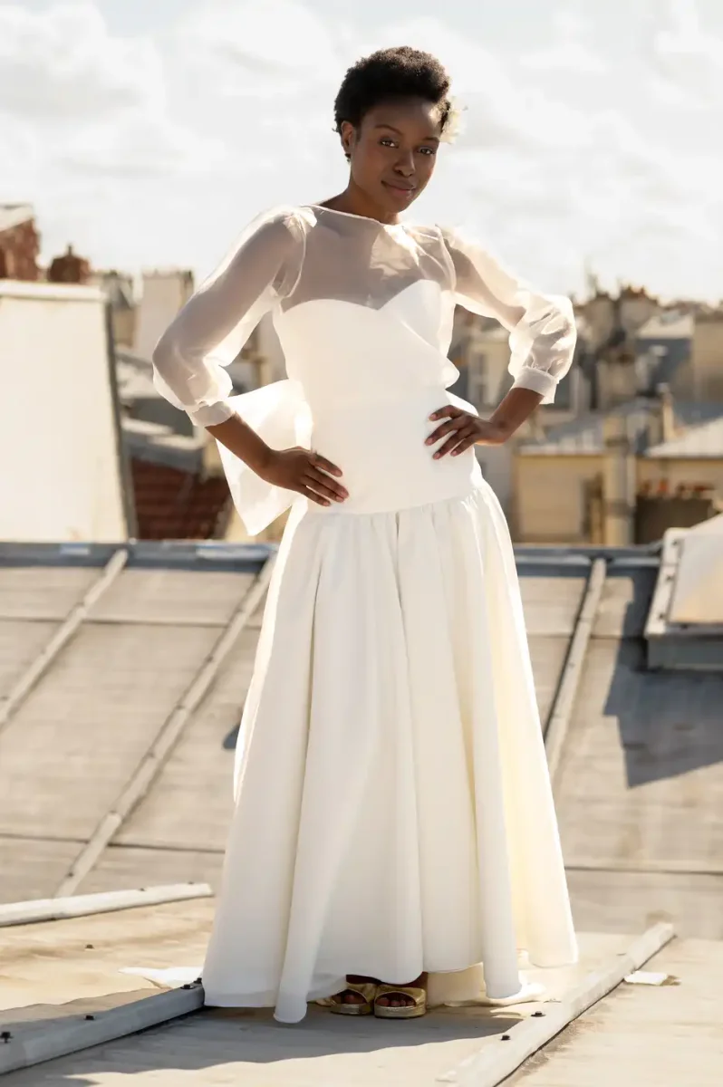 La jupe ample et majestueuse, apporte une touche d’éclat et de légèreté, créant un effet à la fois classique et moderne.