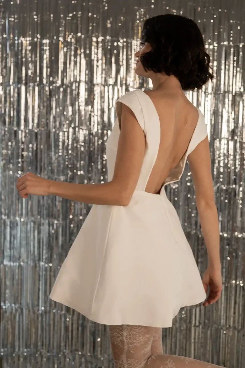 Rayonnez avec cette ensemble tendance et glamour ! Il est composé d’une robe courte réversible, présentée ici sur son côté épuré. À cela s’ajoute un legging en dentelle qui apporte une touche ultra moderne et audacieuse à ce look unique. Parfaite pour un mariage civil, cette tenue est idéale pour les mariées qui veulent se démarquer tout en restant élégantes et dans l’air du temps. ✨